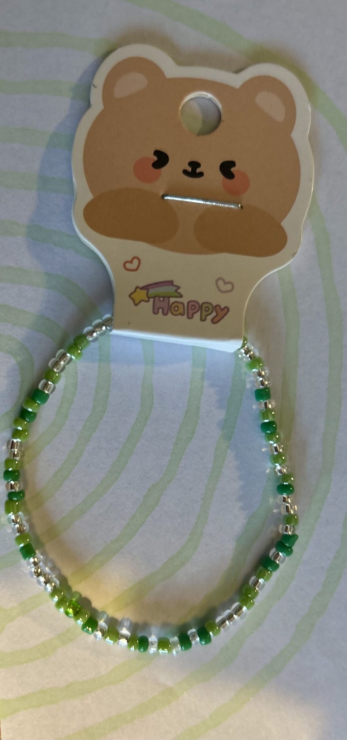 Armbånd laget av slitesterkt elastisk tråd med små grønne og gjennomsiktige glassperler.