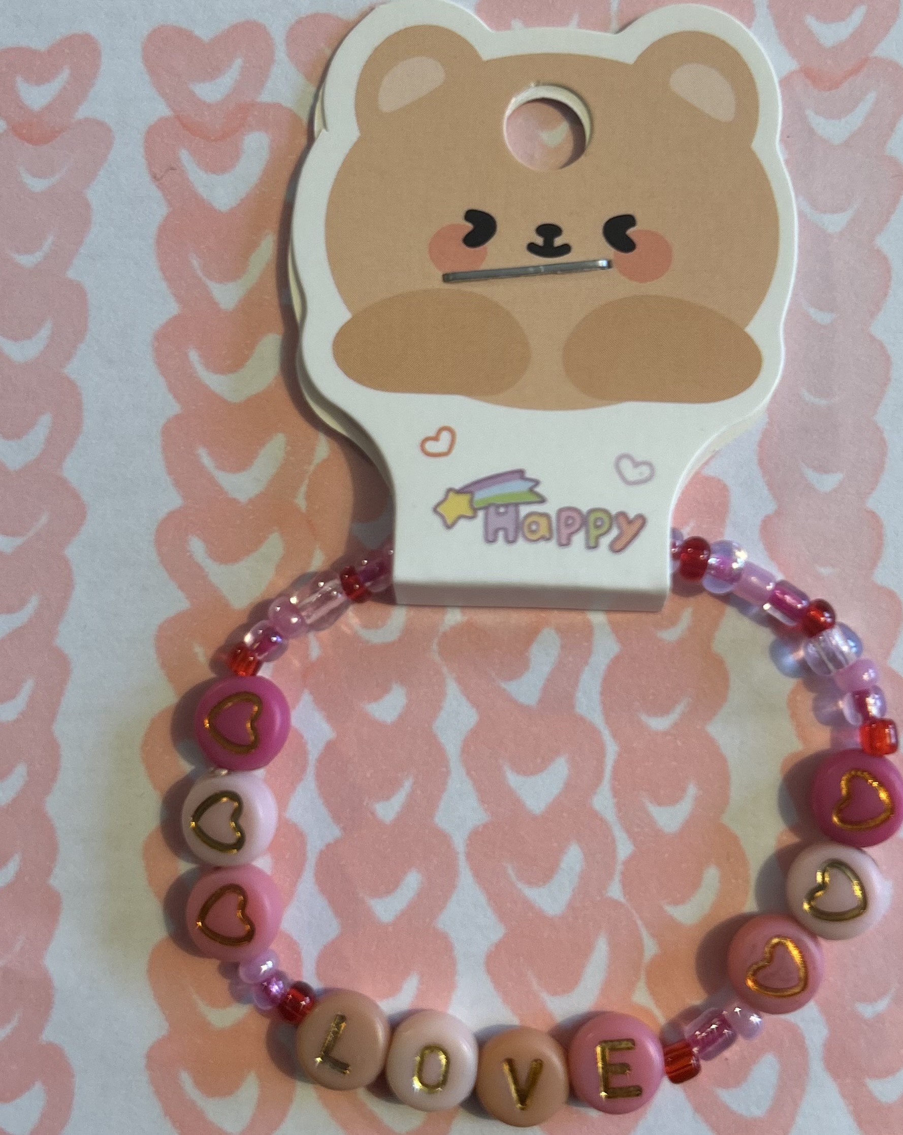 Armbånd laget av slitesterkt elastisk tråd med hjerte perler og små rosa og røde glassperler med LOVE som skrift. PERFEKT SOM VALENTINS GAVE ❤️❤️❤️
