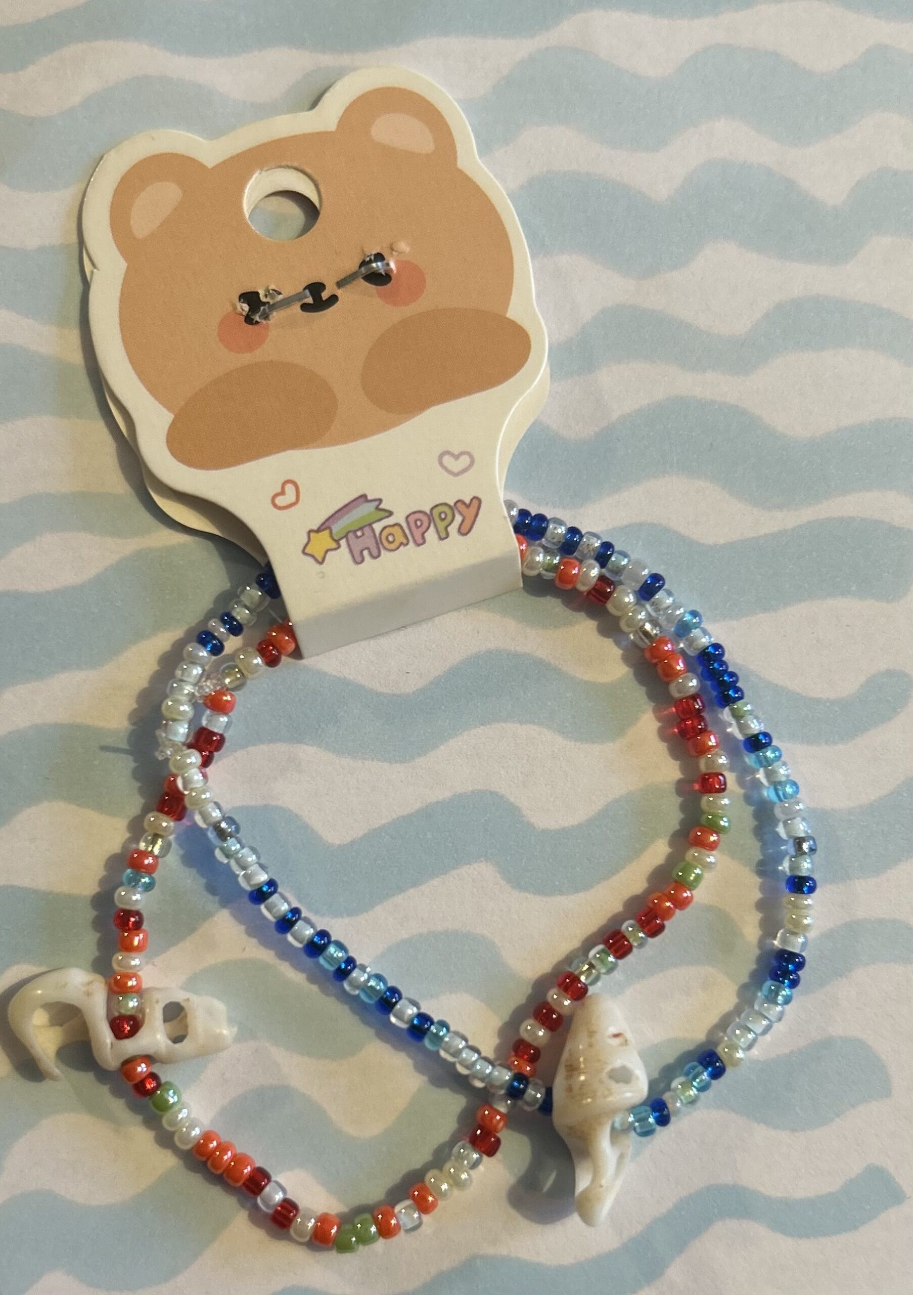 Armbånd 1 laget av slitesterkt elastisk tråd med små hvite, røde og grønne glassperler med ekte havskjell charm. Størrelse 17cm