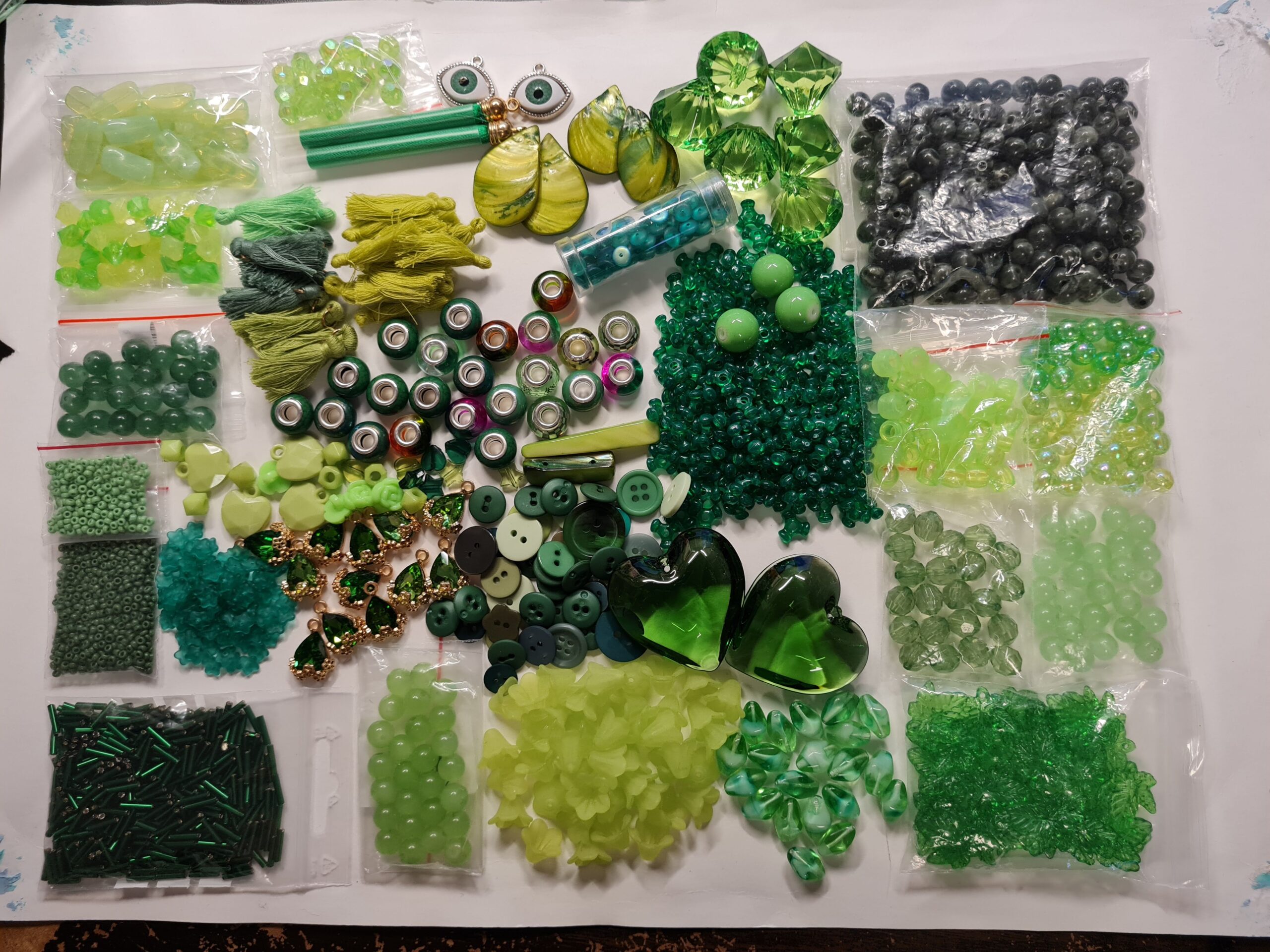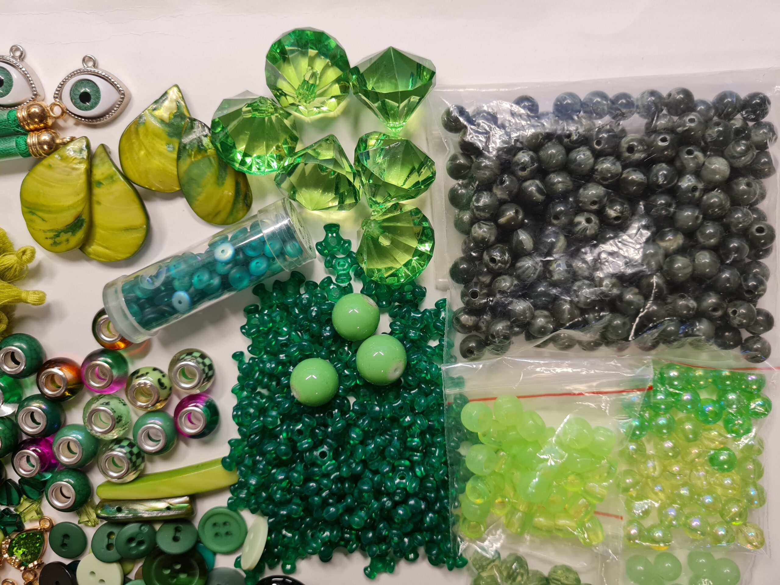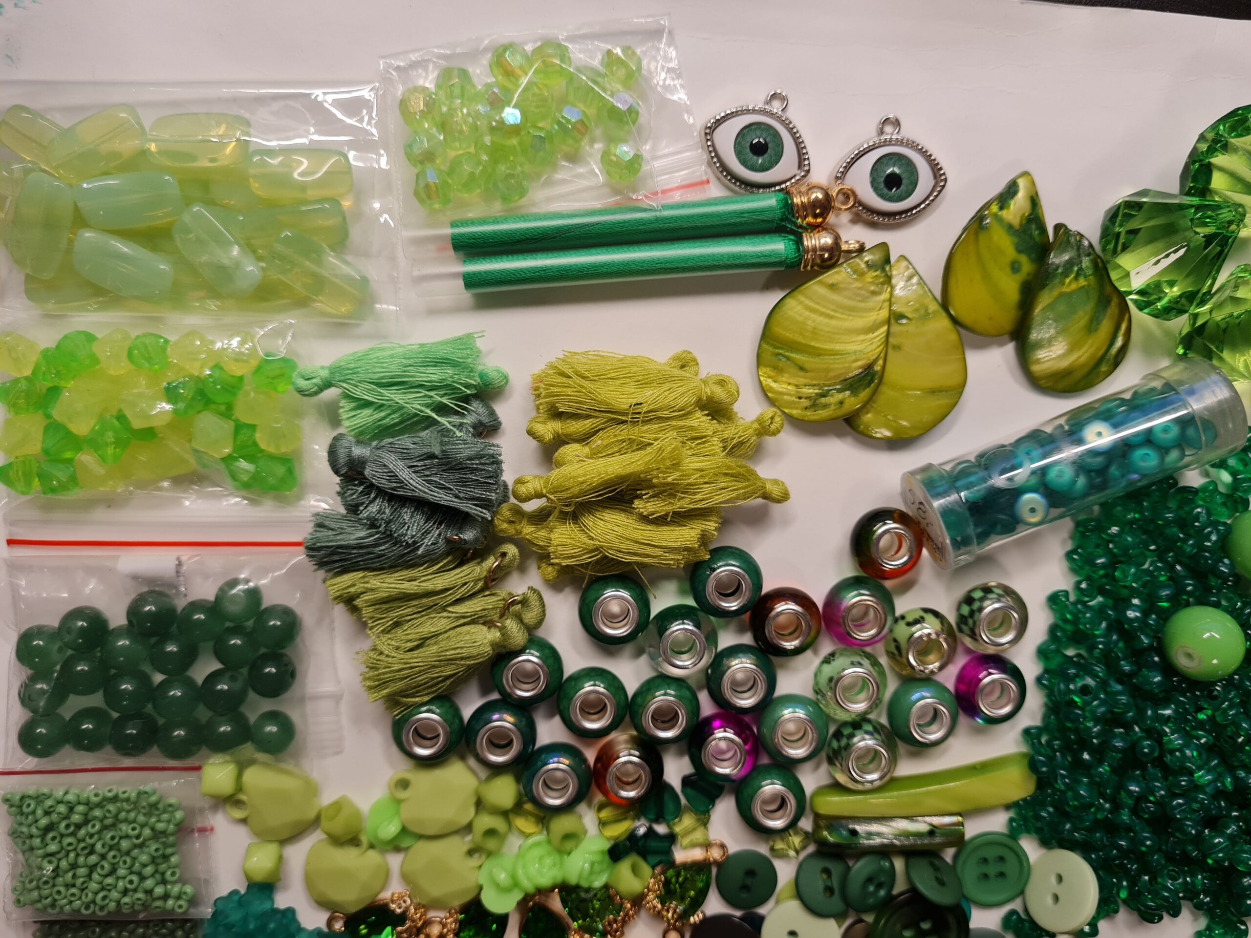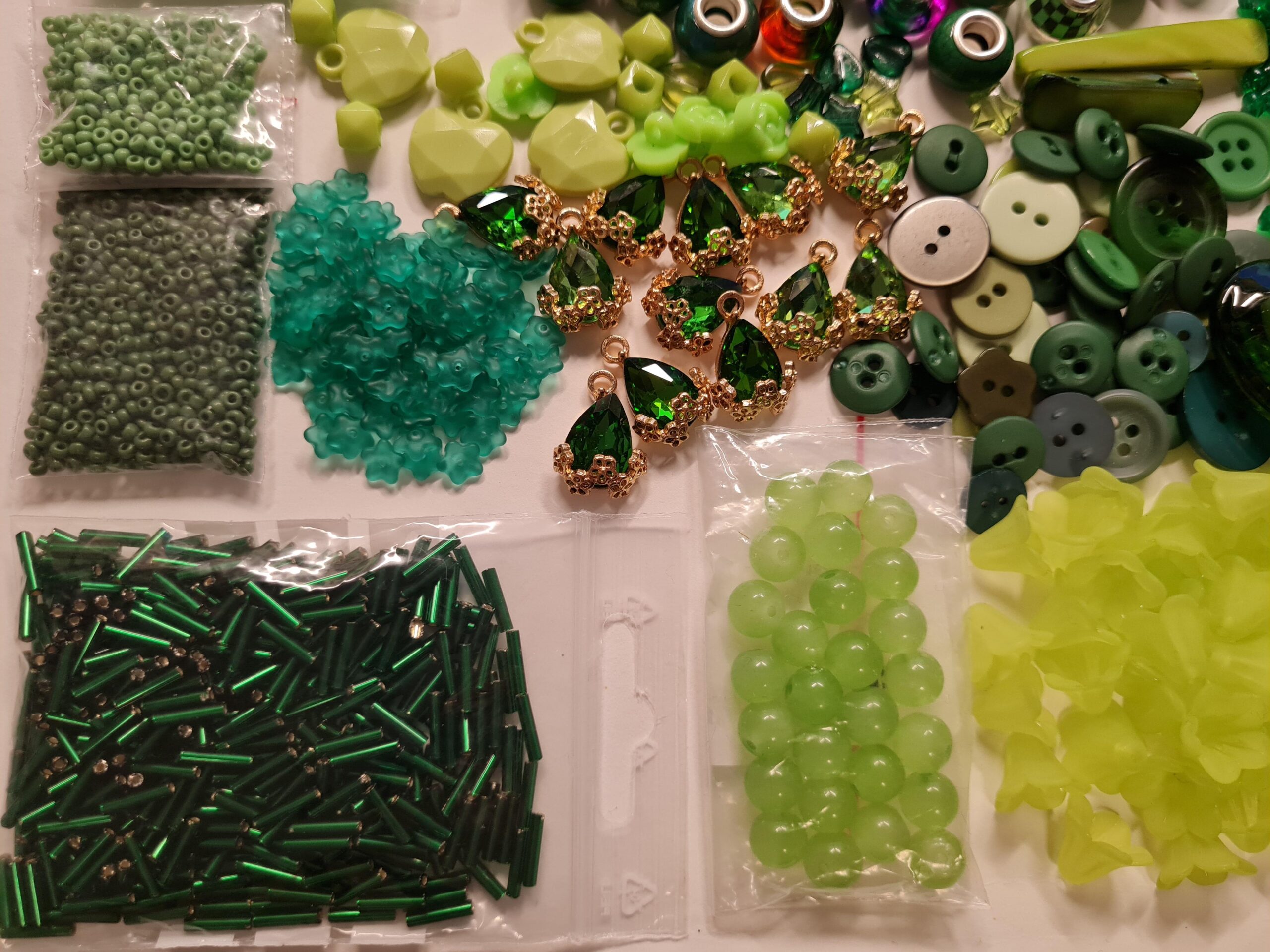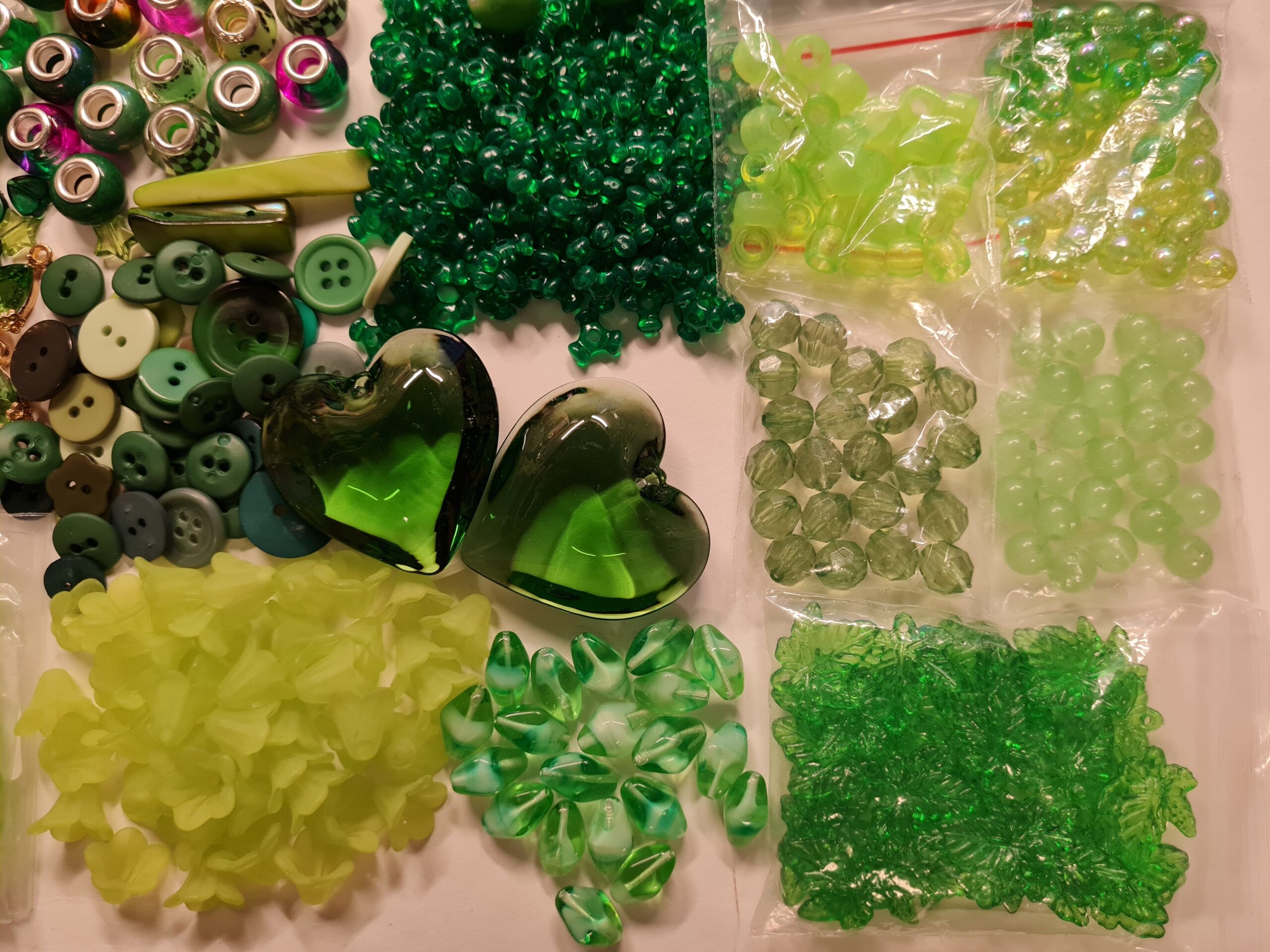 Sett med assorterte grønne perler og knapper i ulike former og størrelser, inkludert hjerteformede perler, runde perler, knapper og frynser. Materialene varierer og egner seg til hobby- og håndverksprosjekter.