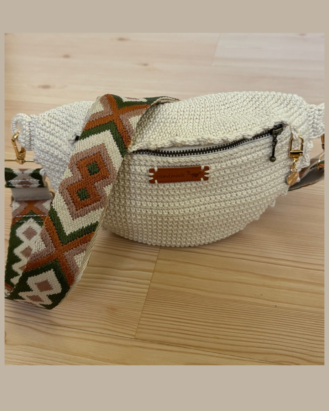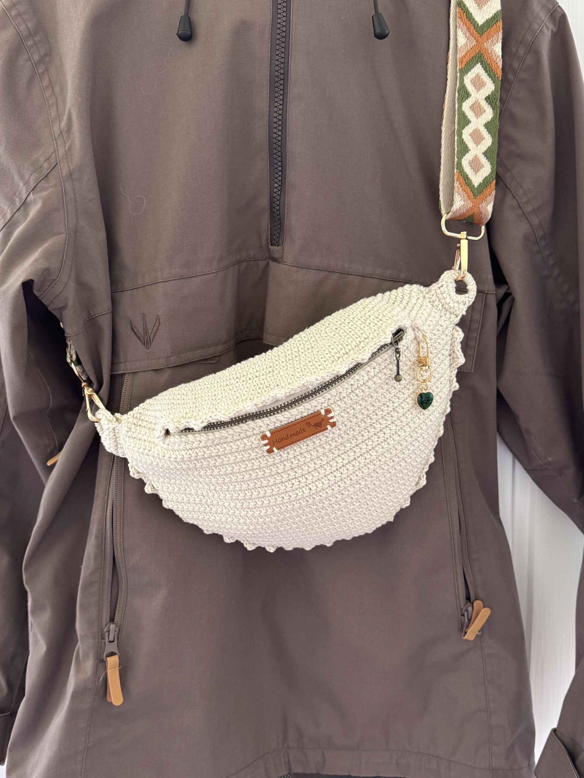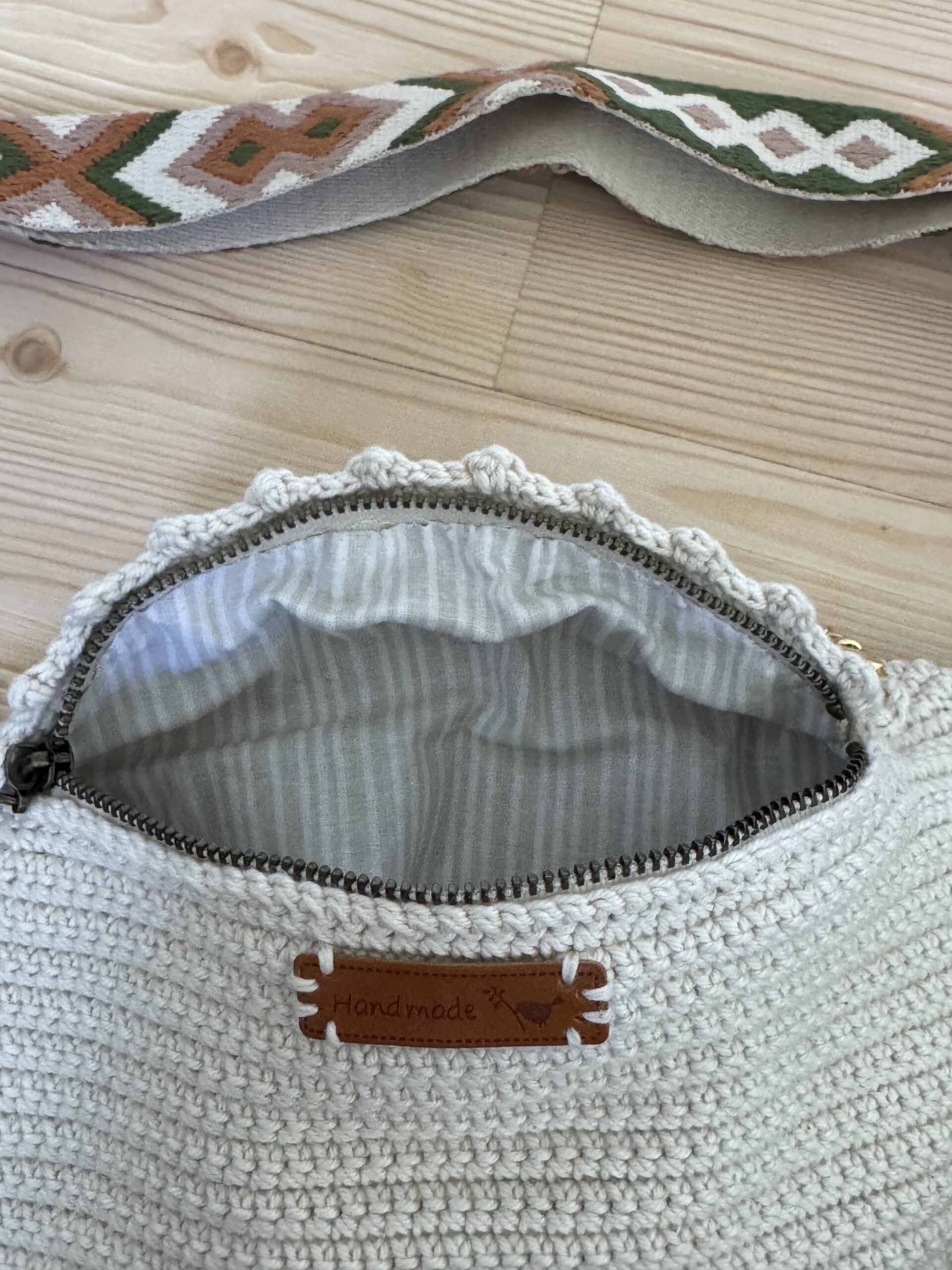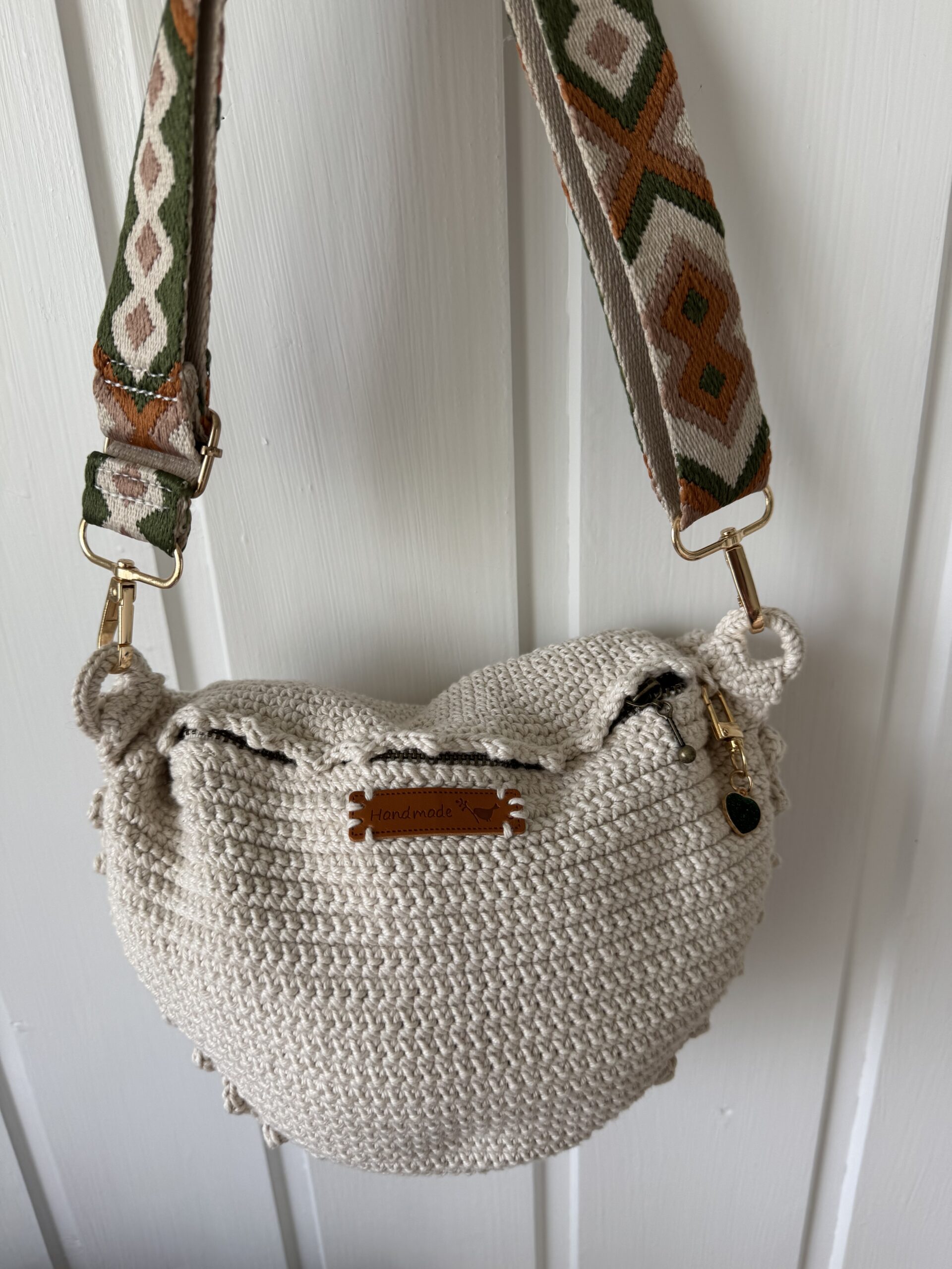 Crossbody/Rumpetaske heklet i 100% bomullsgarn som gjør at den holder fasongen godt. En liten blonde rundt kanten gjør det lille ekstra. En pen skulderreim som matcher den beige fargen, samt et lite grønt hjerte som står i stil til grønnfargen i skulderreimen. Vesken/tasken er like fin rundt livet som over skulderen. Vesken/tasken er foret og har en bredde på 26cm og høyde på 20cm. Skulderreimen er regulerbar og er 4cm bred og 144cm lang. Mitt eget design.