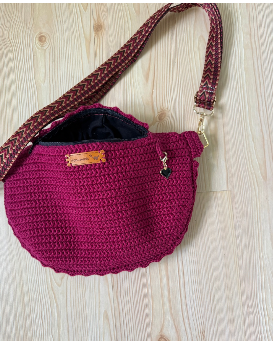 Crossbody/Rumpetaske heklet i bomullsgarn med 10% ull, som gjør at den er myk og god. En heklet blonde rundt kanten som gjør det lille ekstra. Crossbody/rumpetasken er plommeburgunder i fargen, foret med svart  stoff, har en svart glidelås og et svart pyntehjerte, samt en skulderreim som matcher helt perfekt. Like fin til verdas som fest. Mitt eget design. Crossbody/tasken er 24cm bred og 22cm høy. Den justerbare skulderreimen er 2,5 cm bred og 140cm lang.