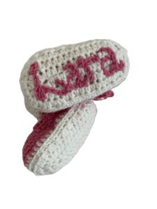 Gjør tøflene enda mer personlig med babyens navn under sålen! Oppgi ønsket navn eller ord i kommentarfeltet ved bestilling. Merk at det er begrenset plass, og koster 150kr mer enn uten navn på. Jeg tar kontakt med deg om det du oppgir må endres.