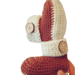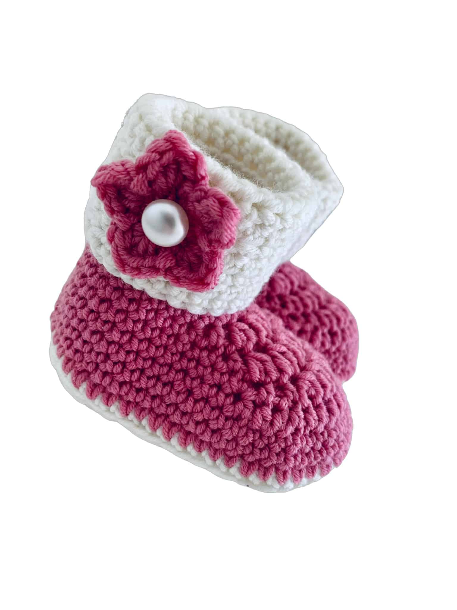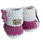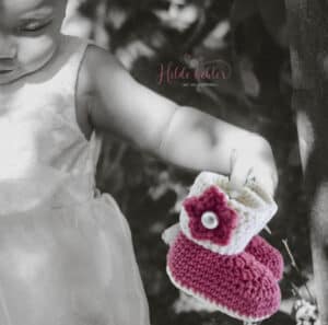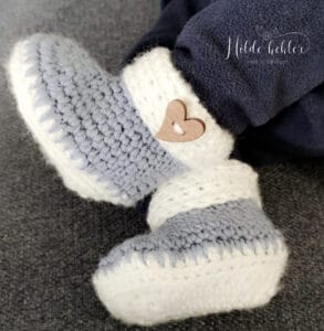 De har en høy kant over ankelen som er brettet ned. På siden er det en pynteknapp: velg mellom treknapp med skriften «made with love», kremhvit perle med heklet blomst, brun hjerteknapp, eller Hilde hekler sin spesialdesignede treknapp. Om du velger en av de tre første syr jeg også på Hilde hekler sitt merke bak en av tøflene.