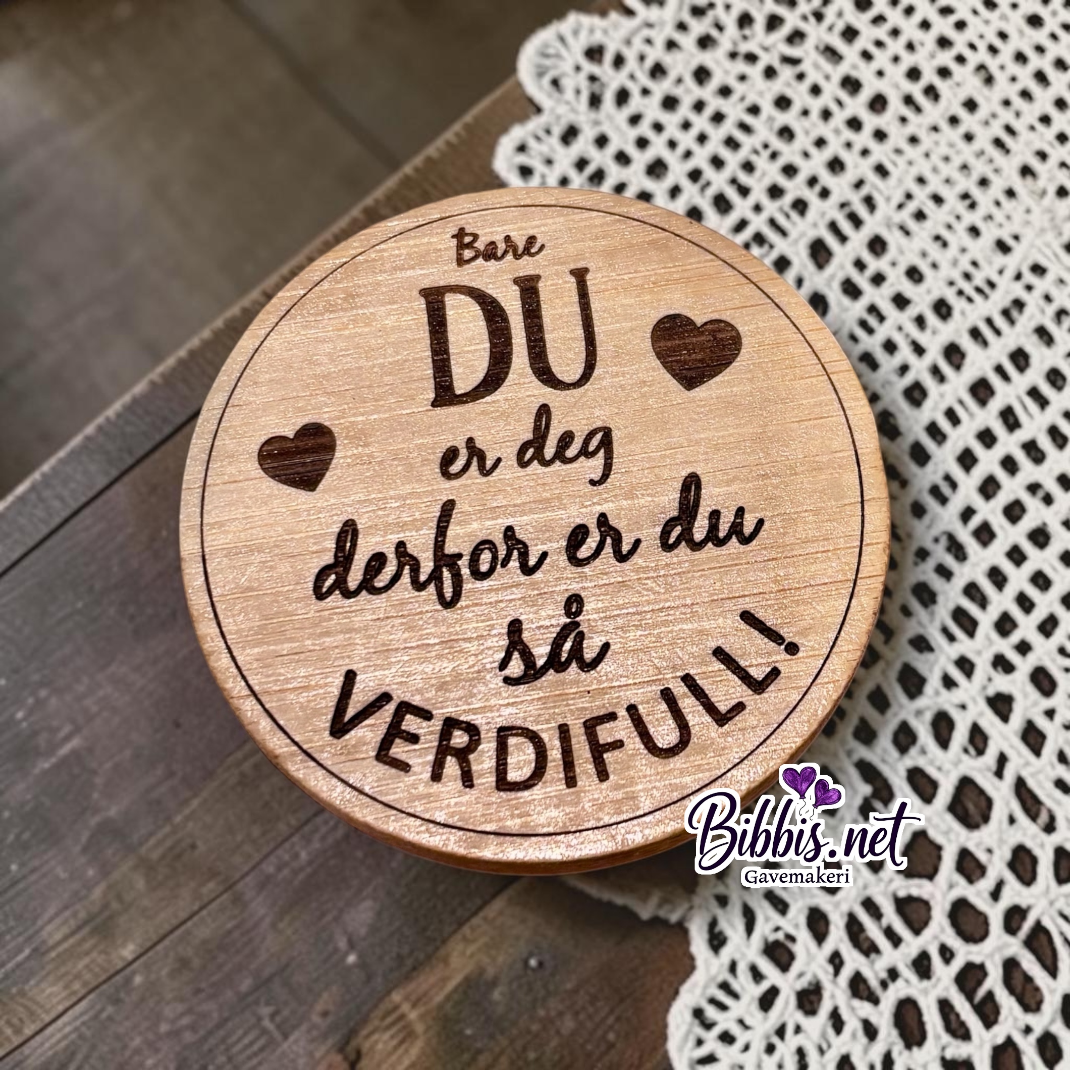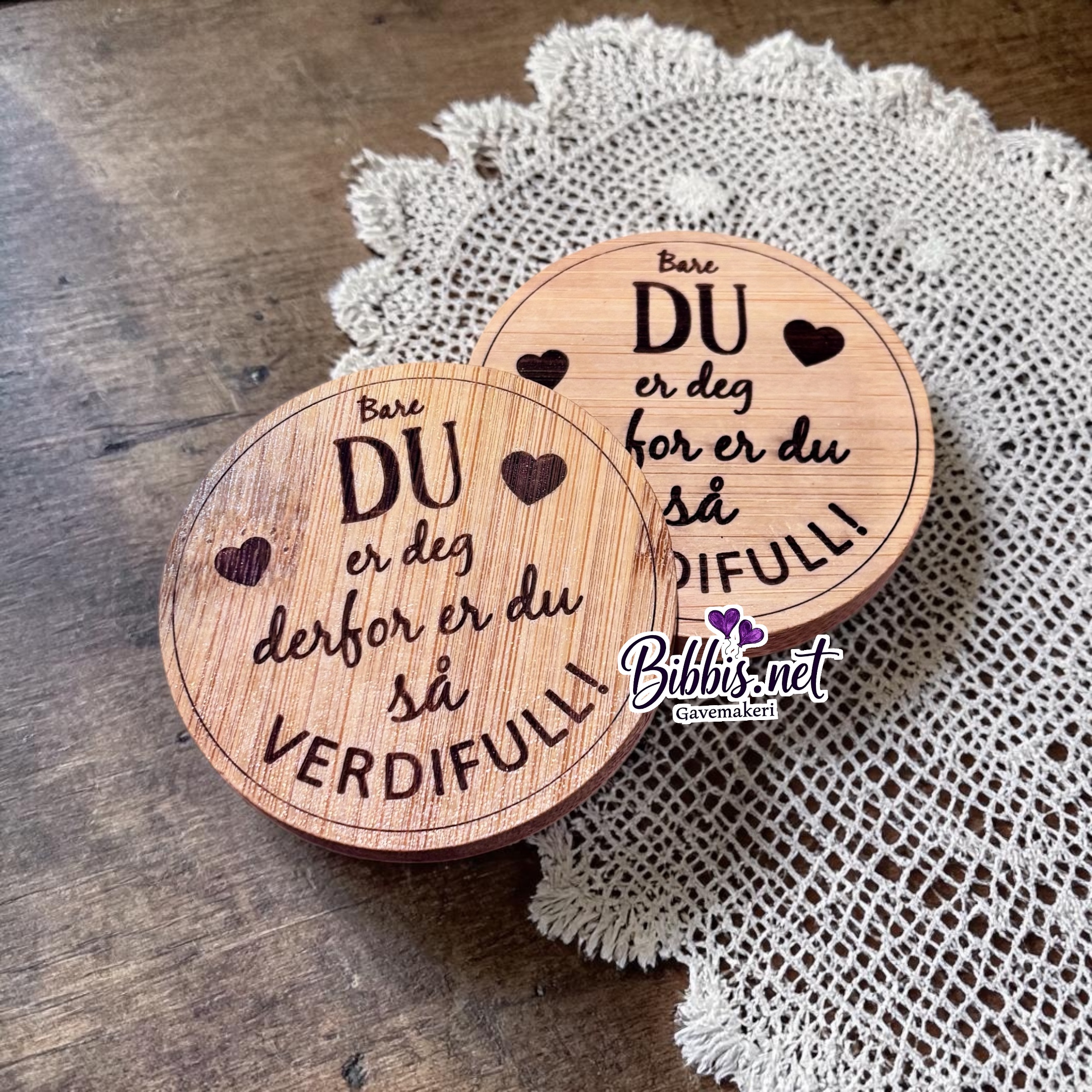 Koselig bambus veskespeil med en supersøt tekst på baksiden. Speilet er 7 cm i diameter og teksten er lasergravert på baksiden.