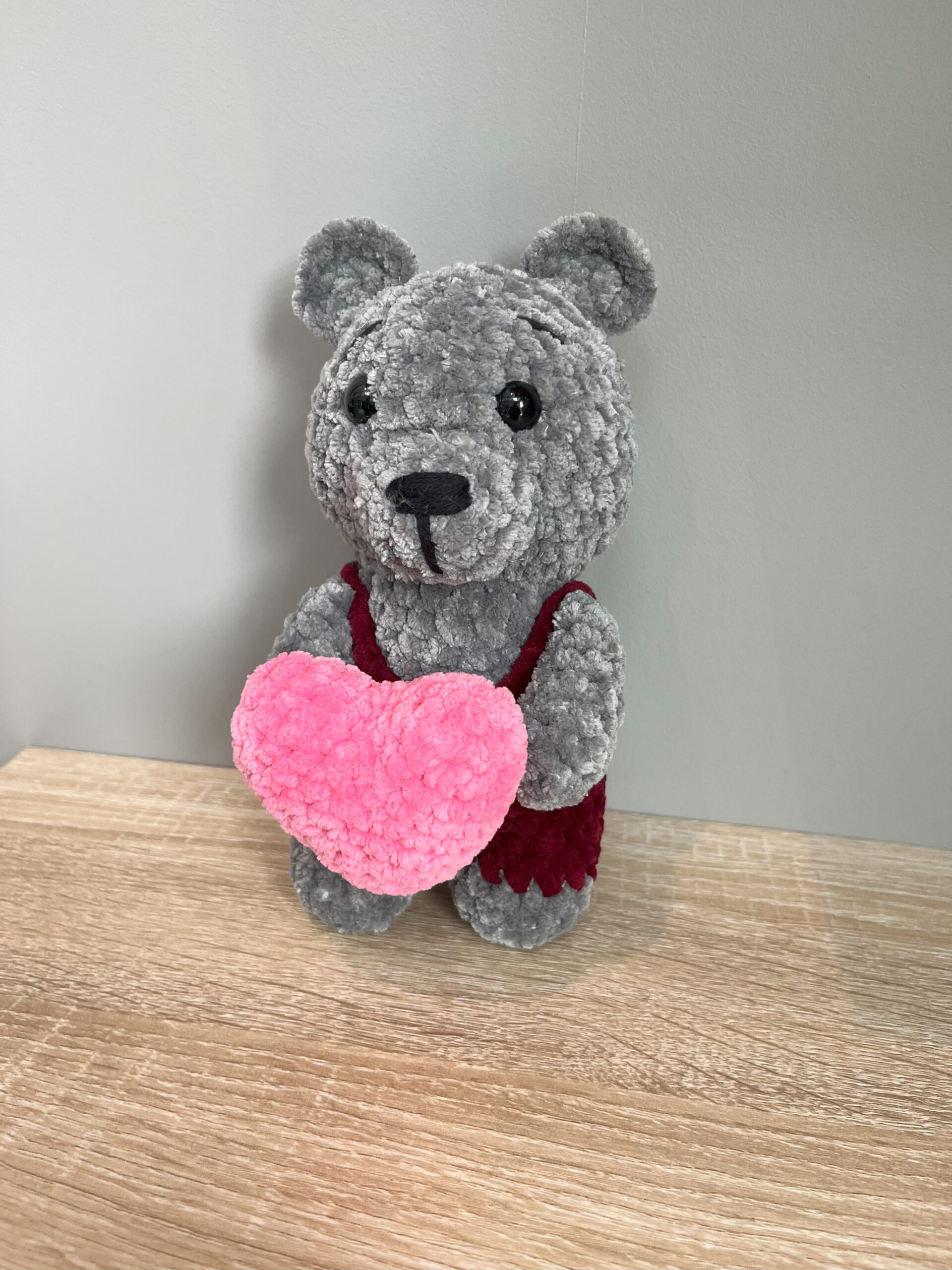 Bamse med hjerte. Kosedyr heklet i Honey Bunny, et godt og mykt chenillegarn. Det er montert sikkerhetsøyne. Anbefalt alder fra 3 år. Høyde ca 20 cm.