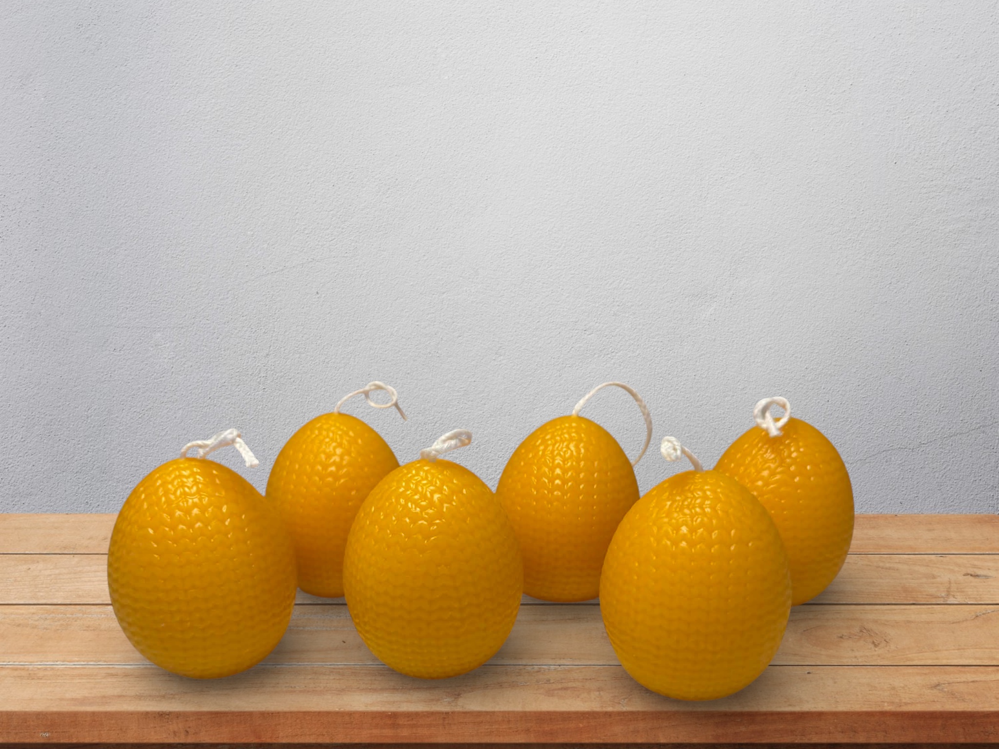 Denne esken rommer seks håndstøpte Egg i ren bivoks, pakket i eggekartong. En liten hyllest til gjenbruk, naturmaterialer og det enkle som får være nettopp enkelt.