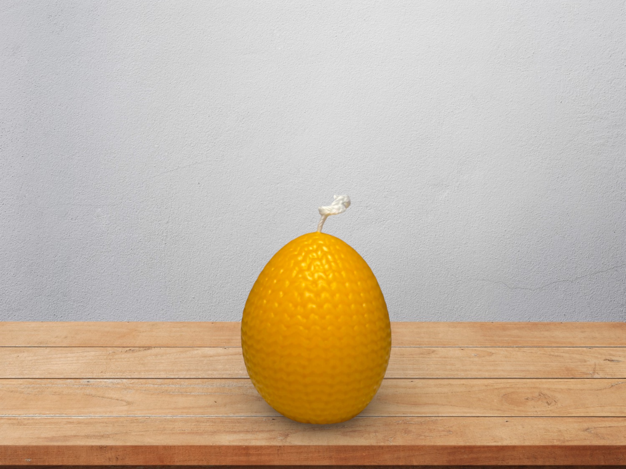 Dette lille egget er støpt i ren bivoks og har et subtilt strikkemønster som gir et mykt, nesten tekstilt uttrykk. Formen er enkel og kjent, men i voks får den et rolig og varmt preg som passer like godt til påskebordet som til en helt vanlig tirsdag med tent lys.