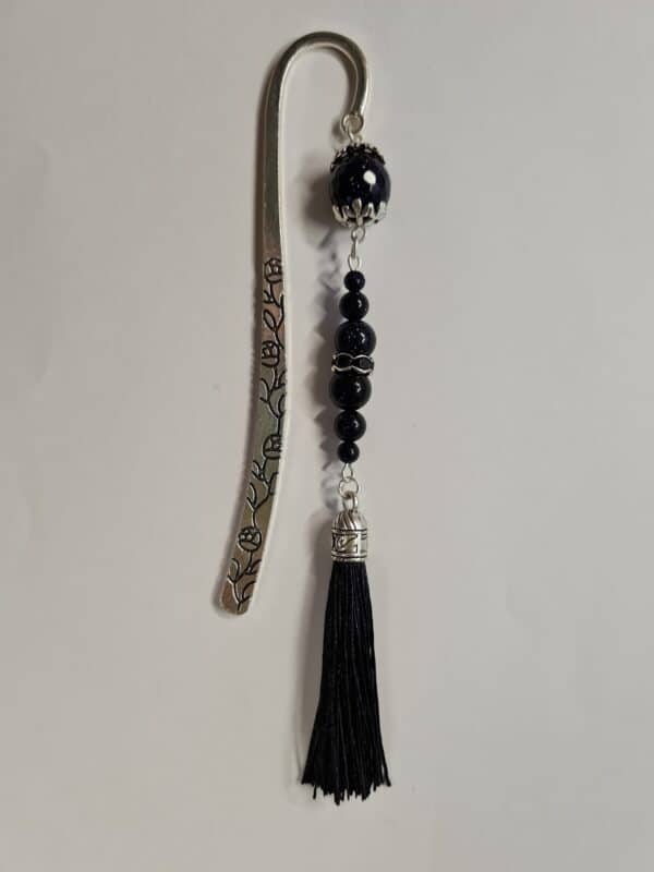 Bokmerket er laget med svarte sandstone perler som blinker i blått.