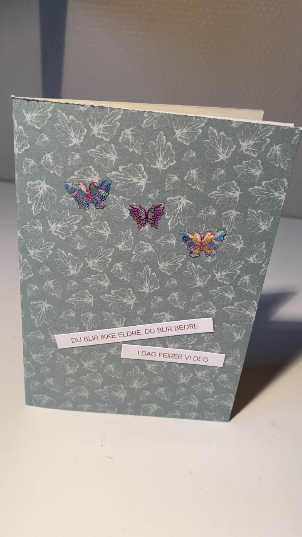 Bursdagskort i turkis/grønn med tre sommerfugler på. Kortet har tekstene «Du blir ikke eldre, du blir bedre» og «I dag feirer vi deg».