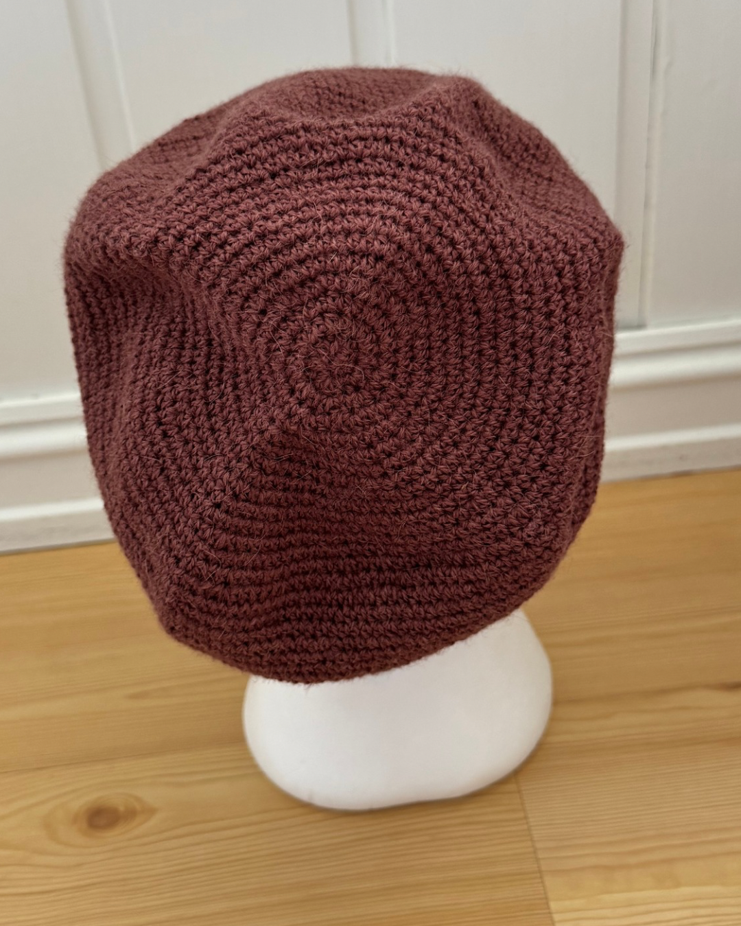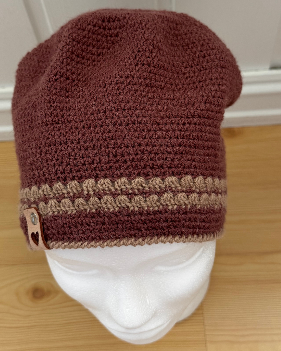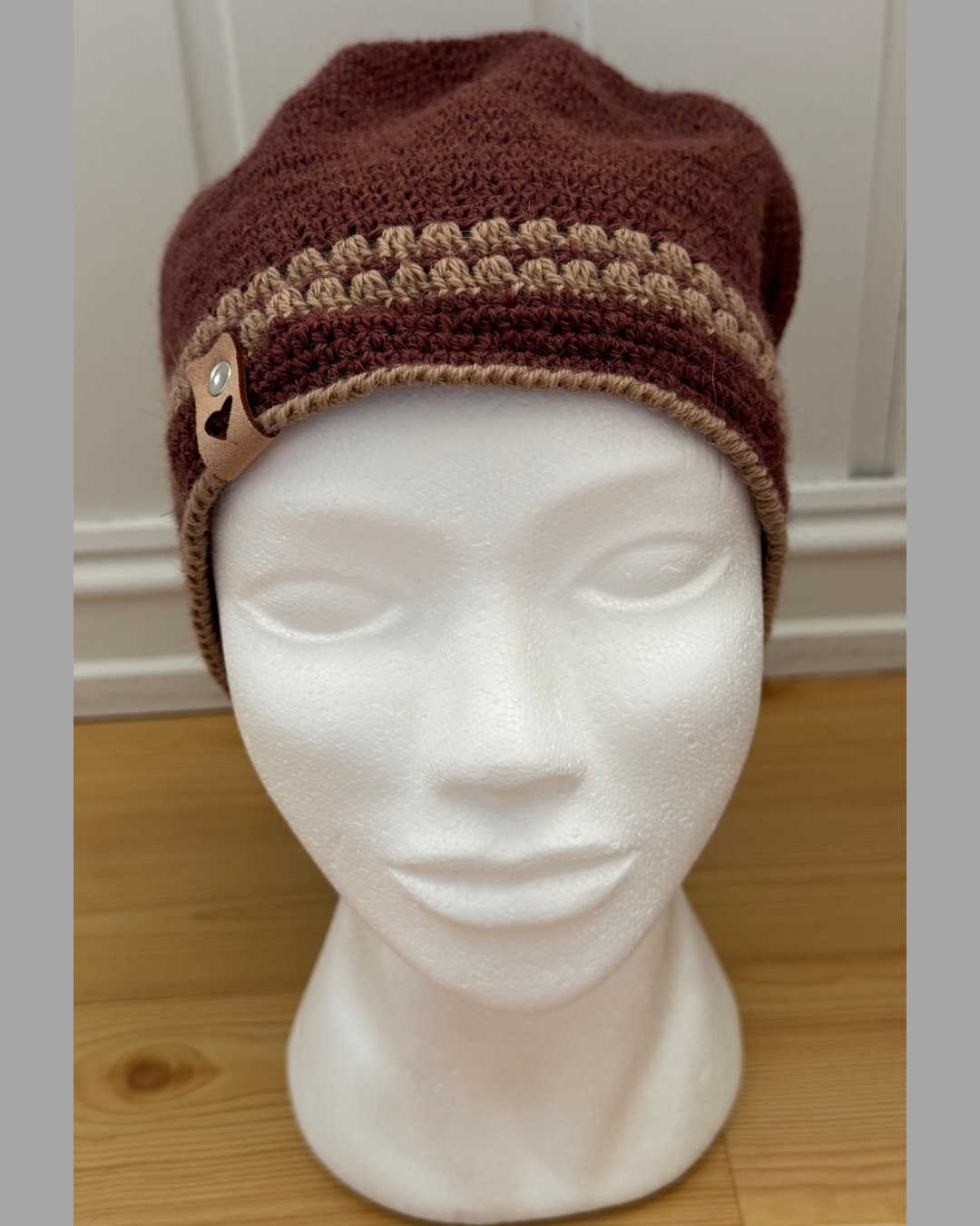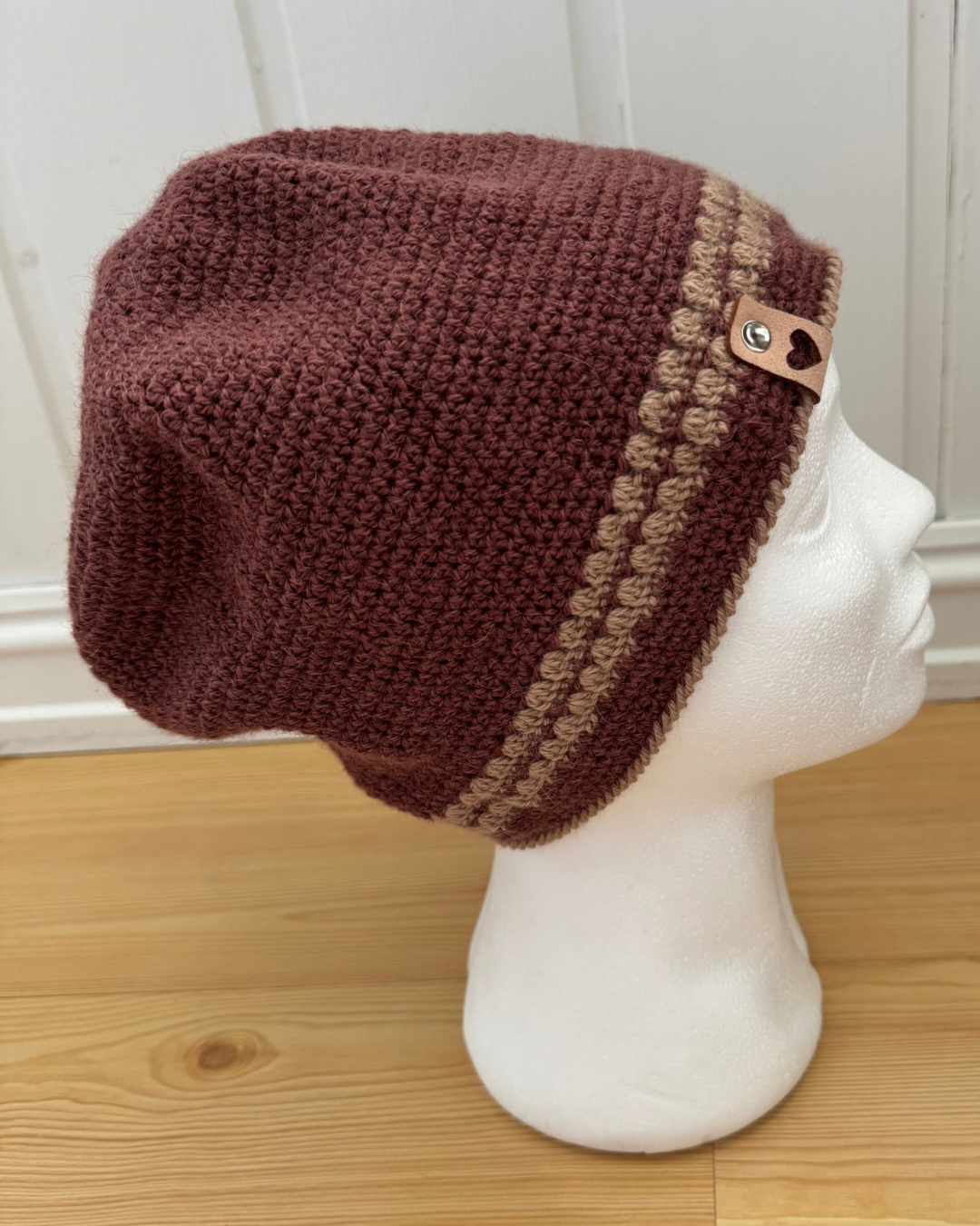 God og varm damelue heklet i alpakkagarn. Fargen er noe ubestemmelig men jeg vil kalle den for ferskenbrun. Fargen kommer godt fram på bildene. Luen har to kontrast striper samt en pyntekant nederst. Vil si at den er litt baggy i fasongen og dette er mitt eget design. Luen er 56cm i diameter og høyden er 24cm.