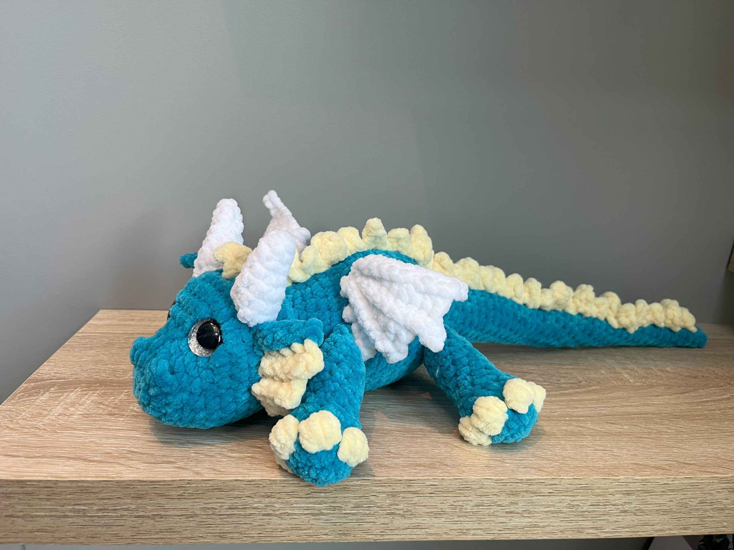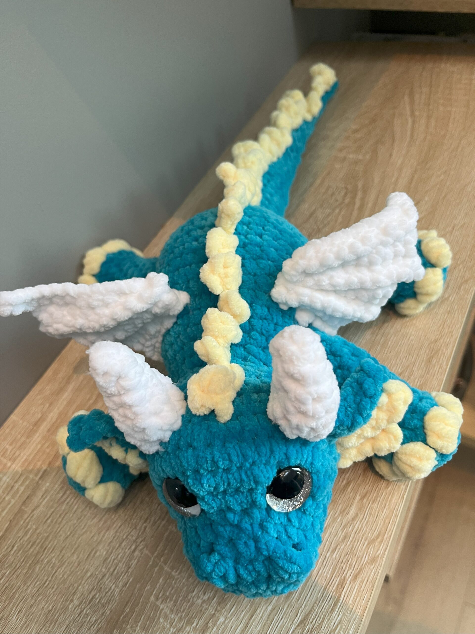 Drage. Kosedyr heklet i Honey Bunny, et godt og mykt chenillegarn. Det er montert sikkerhetsøyne. Anbefalt alder fra 3 år. Lengde ca 45 cm.