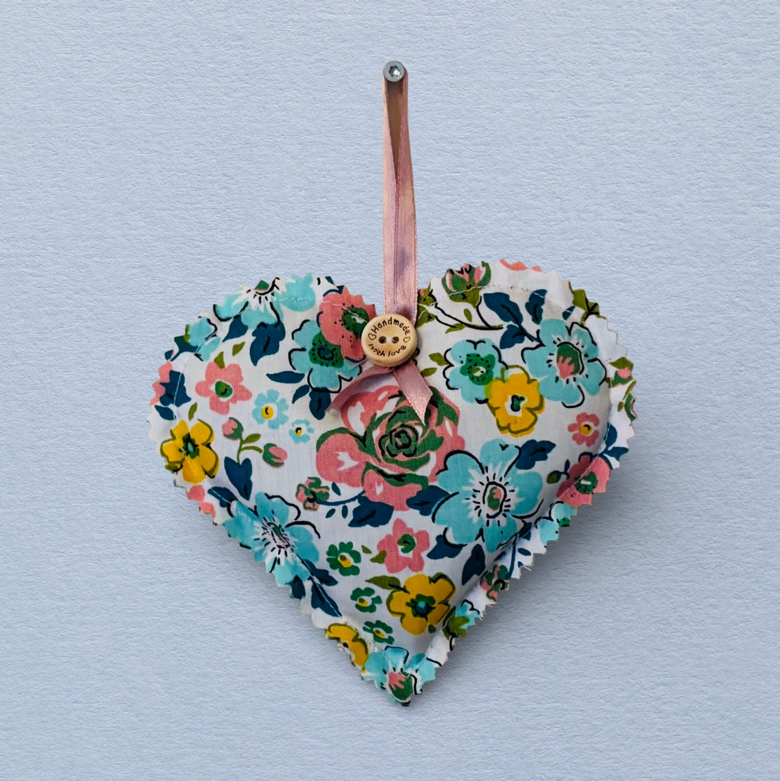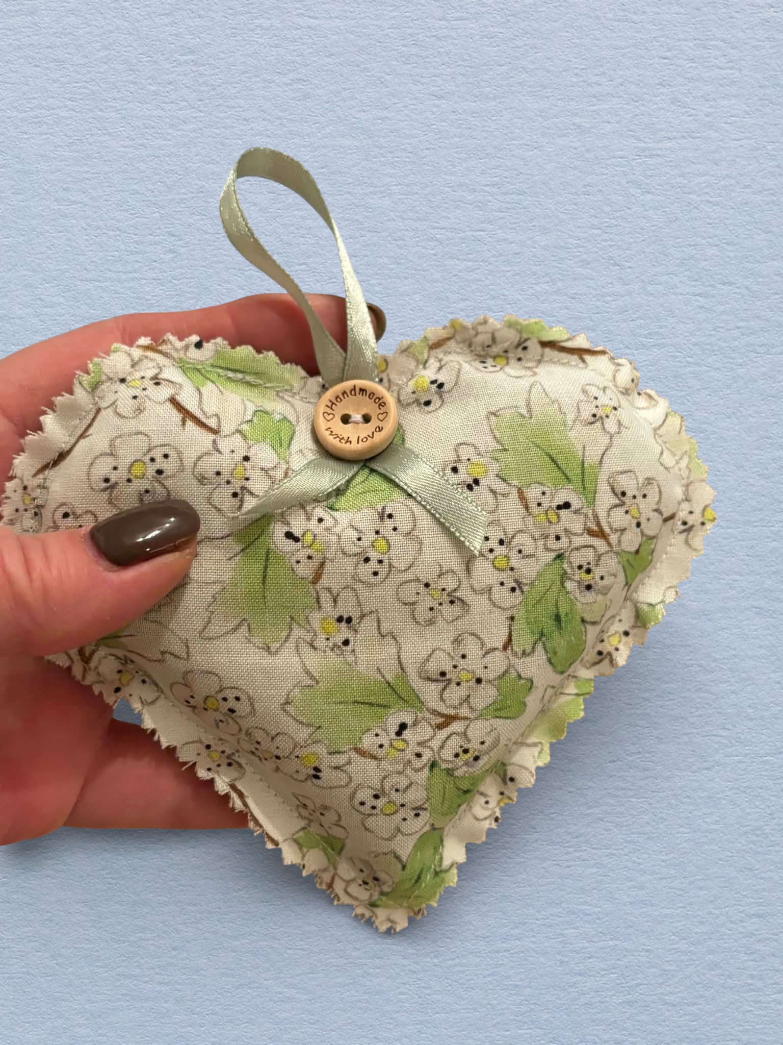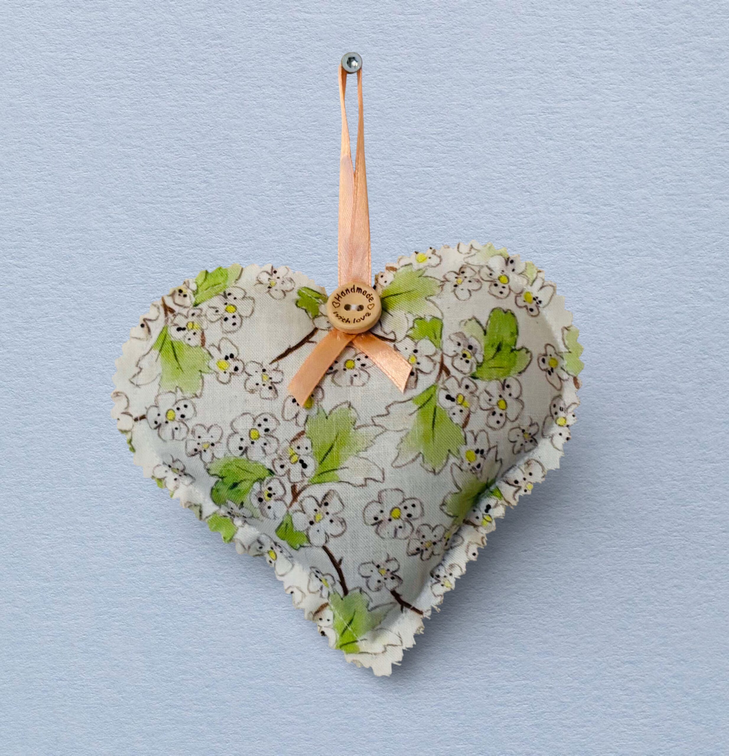 Håndlaget hjerteformet duftpose fylt med naturlig tørket lavendel. Hvert hjerte veier mellom 27 og 30 gram og er ca. 13,5 × 12 cm. Stoffet er av økologisk bomull. Prisen gjelder ett hjerte.