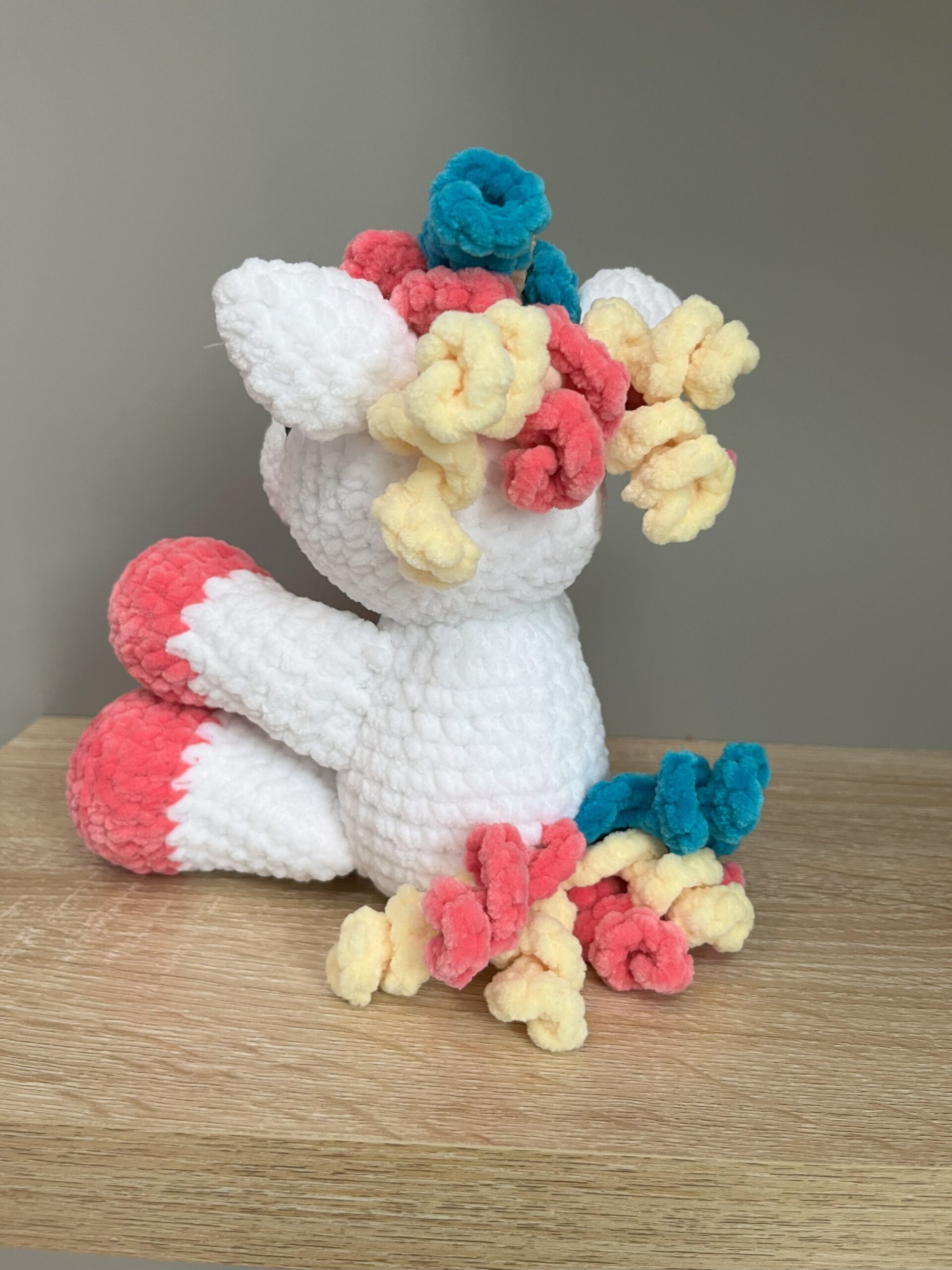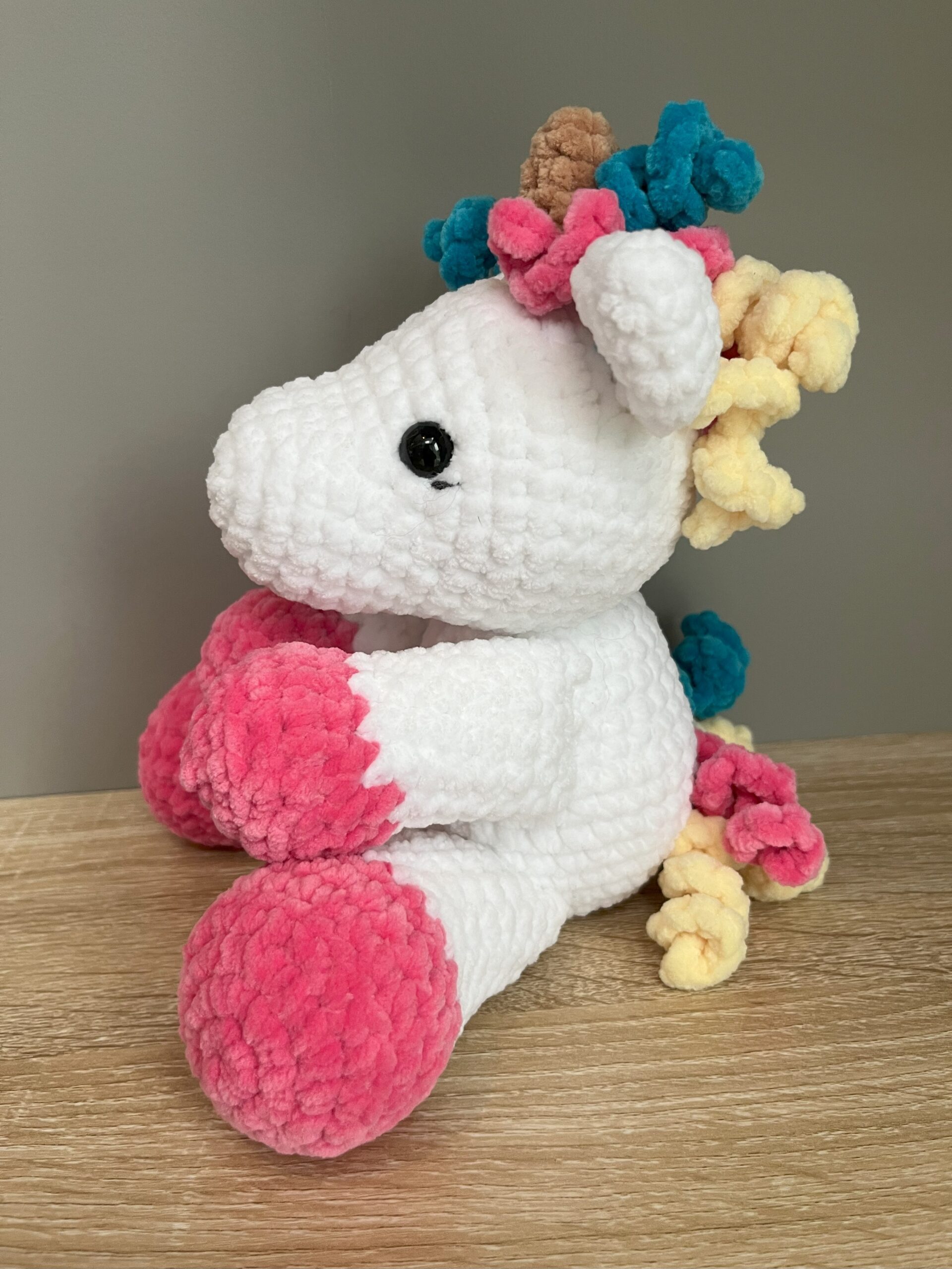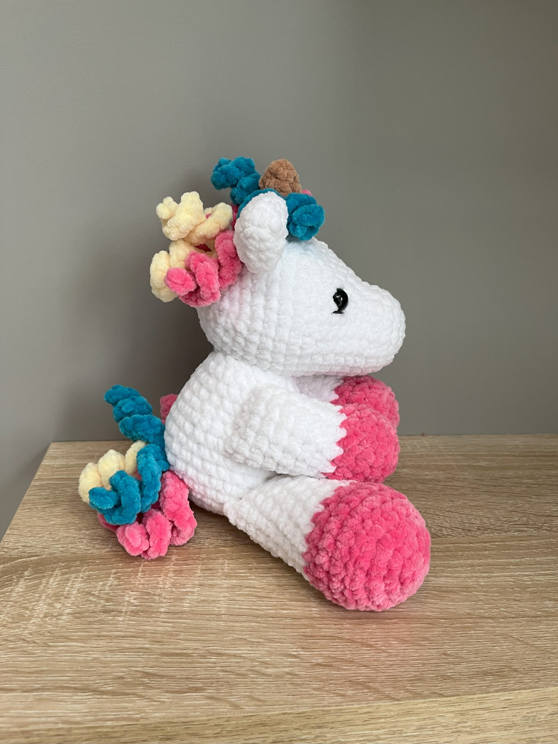 Enhjørning. Kosedyr heklet i Honey Bunny, et godt og mykt chenillegarn. Det er montert sikkerhetsøyne. Anbefalt alder fra 3 år. Høyde ca 30 cm. Sittende høyde ca 22 cm.