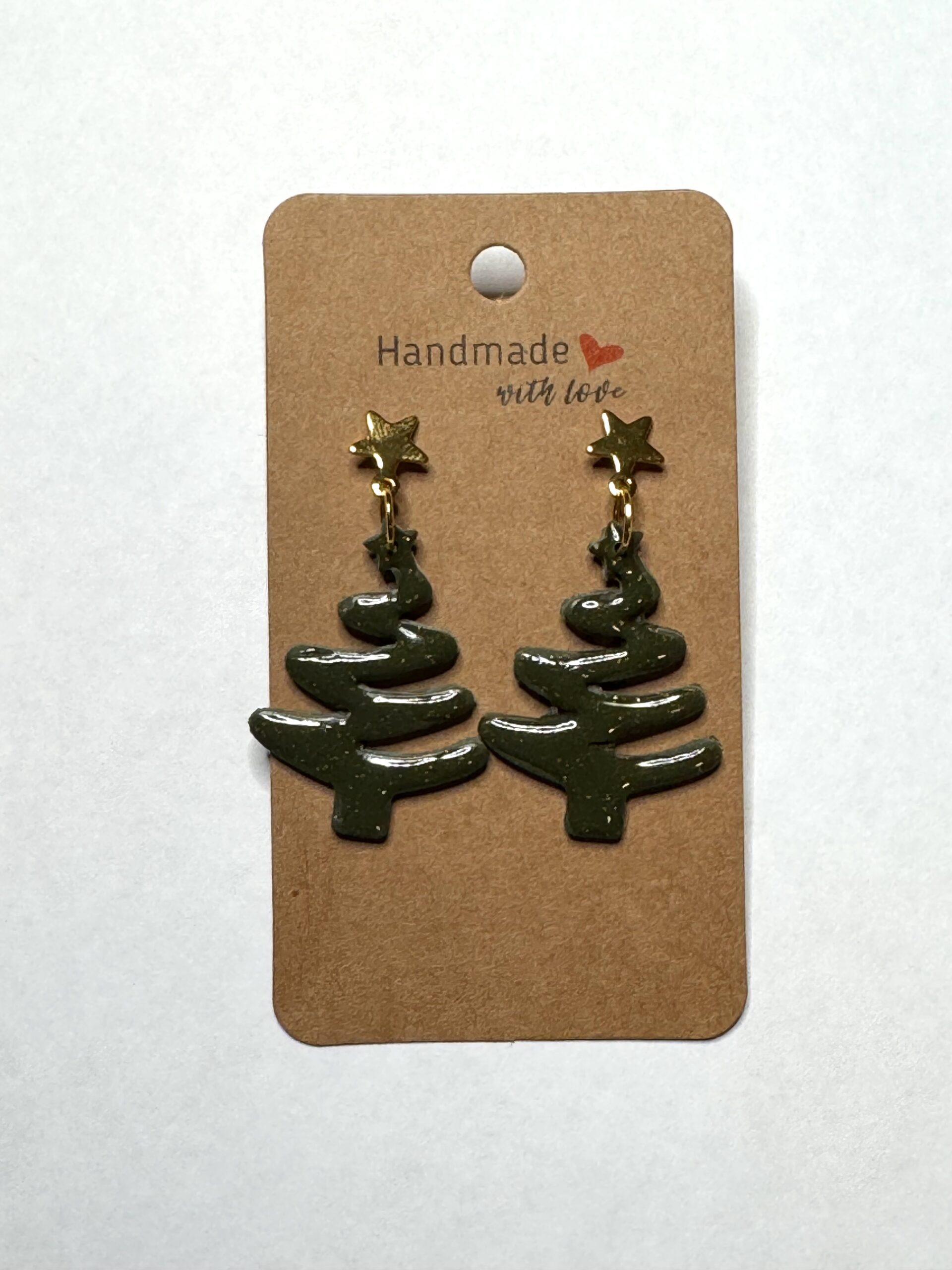 Håndlagde øredobber i polymerleire, formet som små juletrær med gullfargede stjerneøredobber. Enkle, søte og perfekte til juleantrekket.
