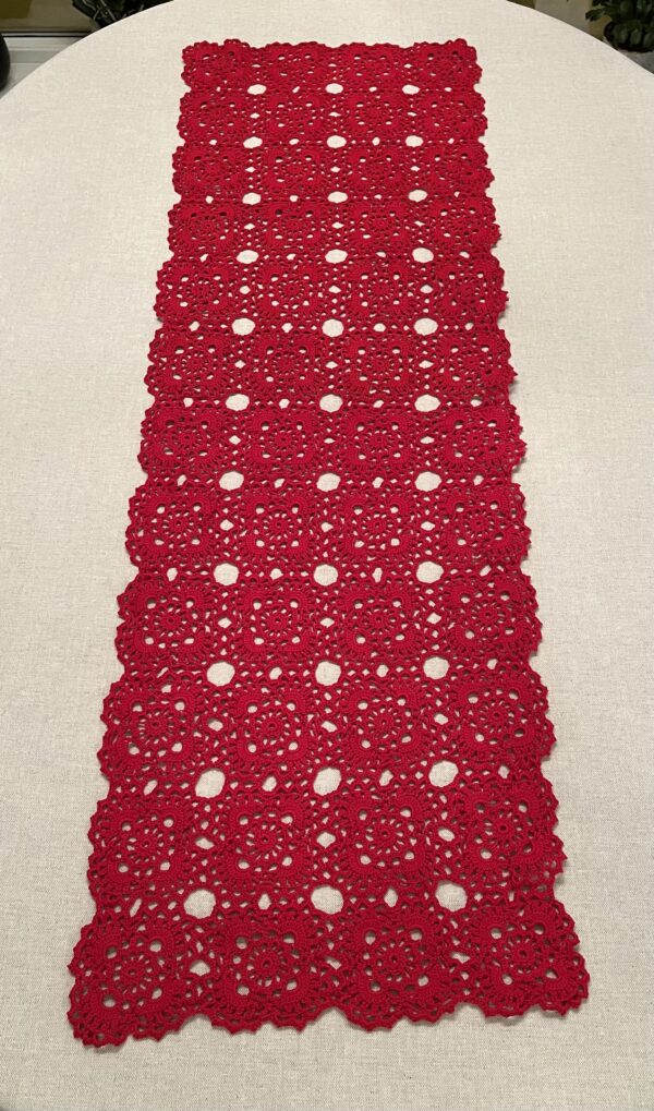 Nydelig løper som passer både til salong og spisebord. Den er heklet i garnet «Nelly» fra Solberg. Den er ca 115 cm lang og 36 cm bred. Den kan vaskes på 60 grader