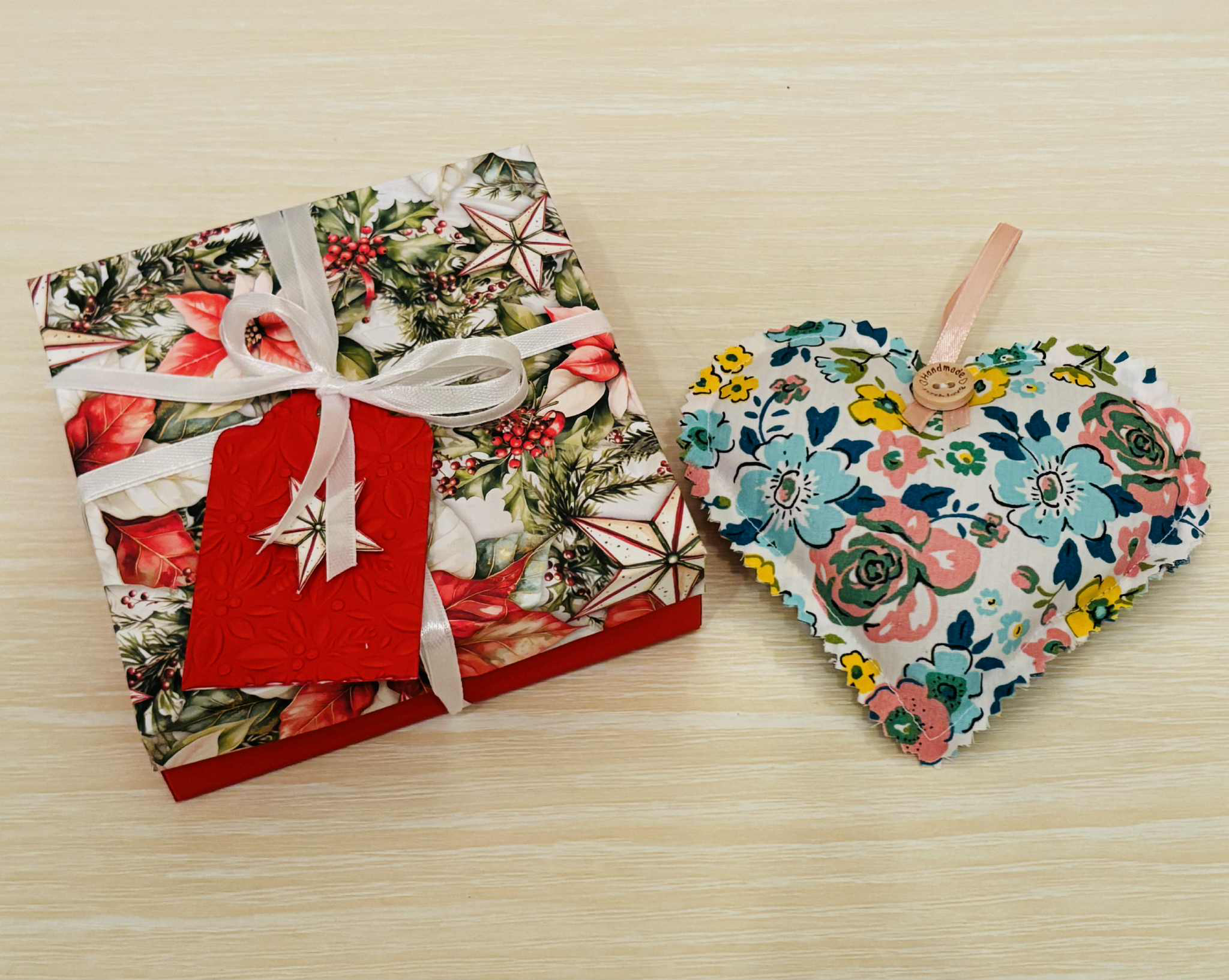 Håndlaget hjerteformet duftpose kun fylt med naturlig tørket lavendel. Den veier mellom 27 og 30 gram, og er ca 13,5 x 12 cm. Stoffet er av økologisk bomull. Hjertet er pakket i håndlaget julegaveeske med tilhørende pakkelapp.