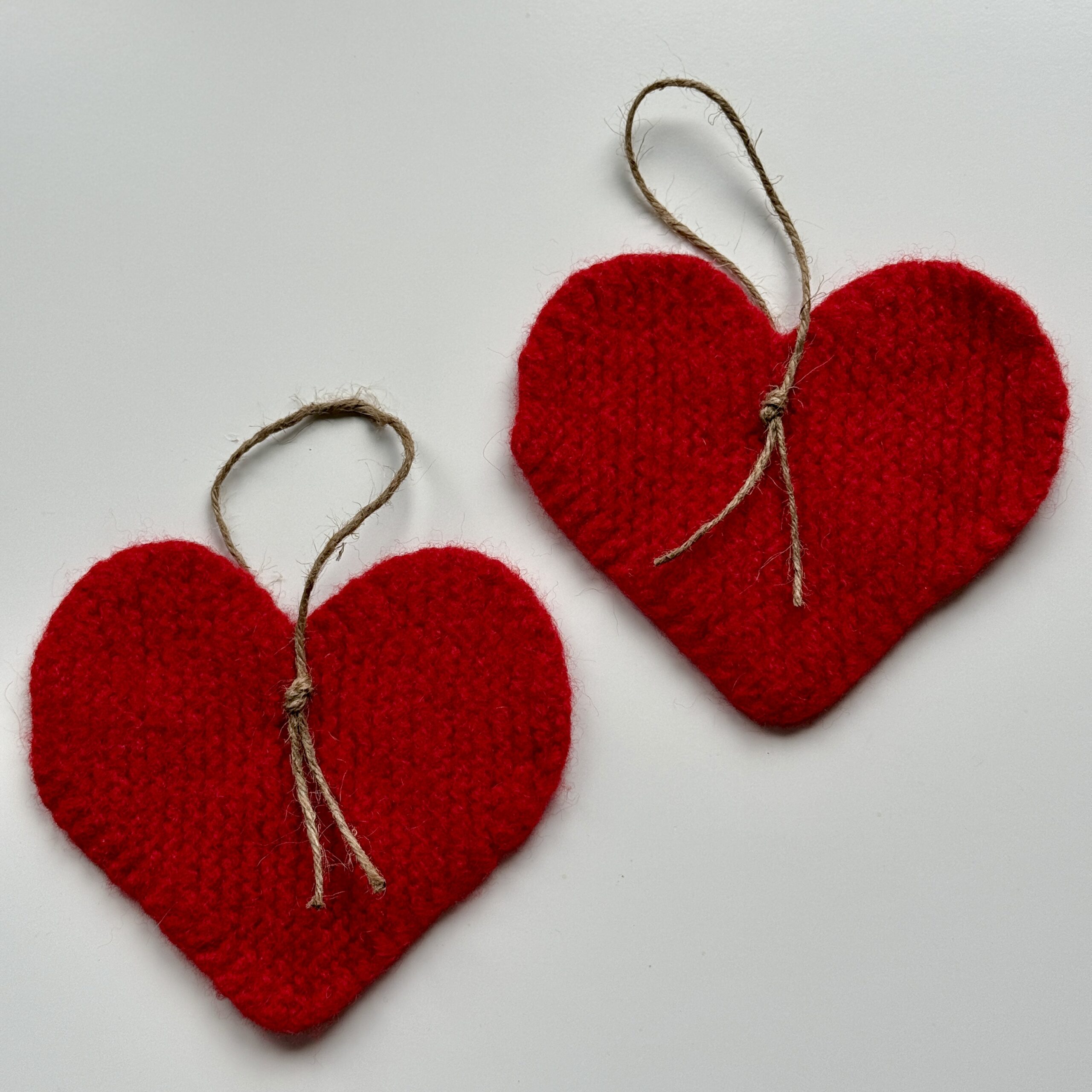Strikka og tova hjerter, fine som dekorasjon til advent og jul. De henger pent i en hamptråd.