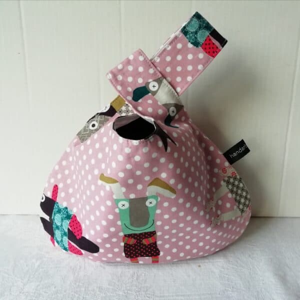 Japansk knutepose som er praktisk å ha som strikke/hekle/prosjektpose. Tre den inn på armen og ta med strikketøyet på tur. Kan og brukast til andre ting.
