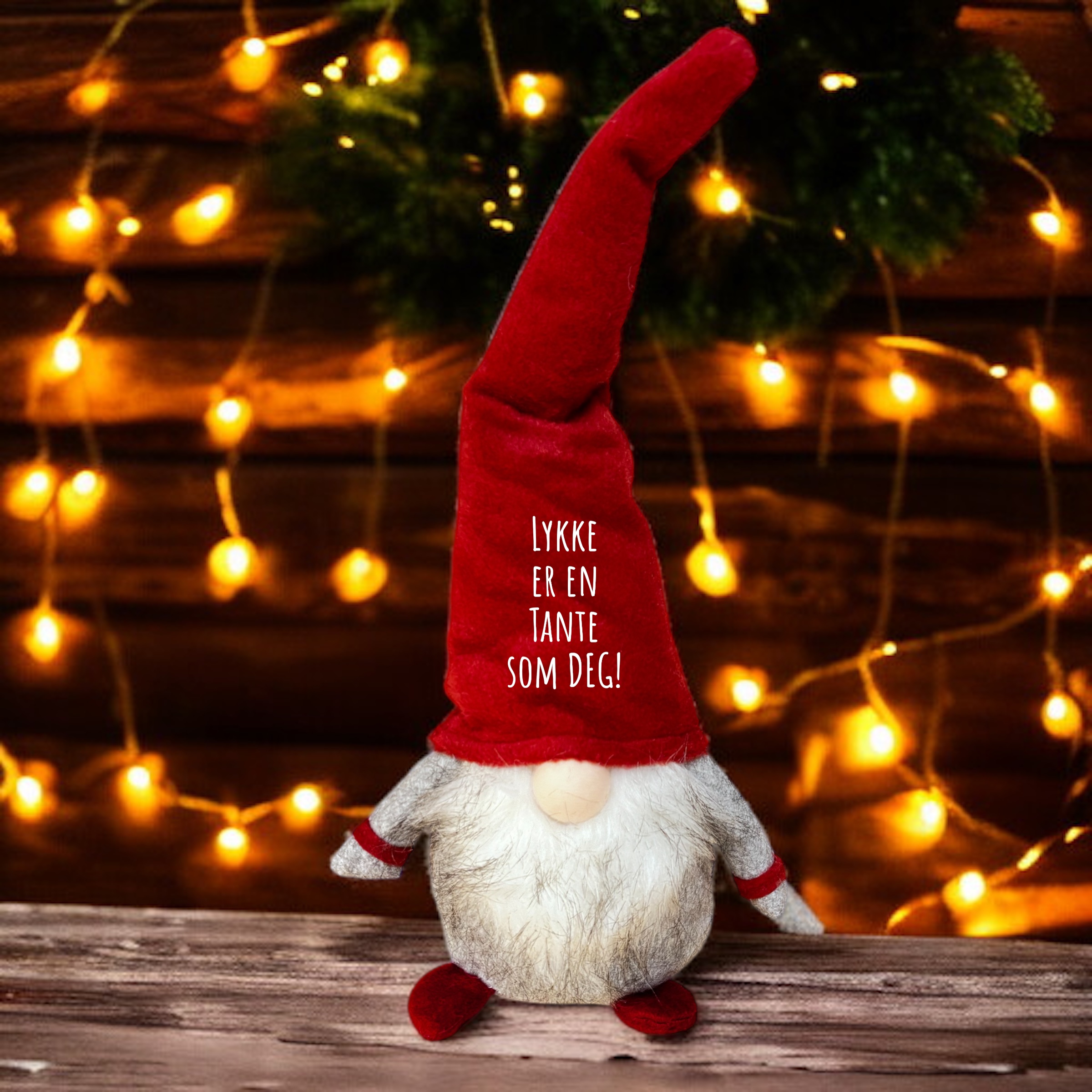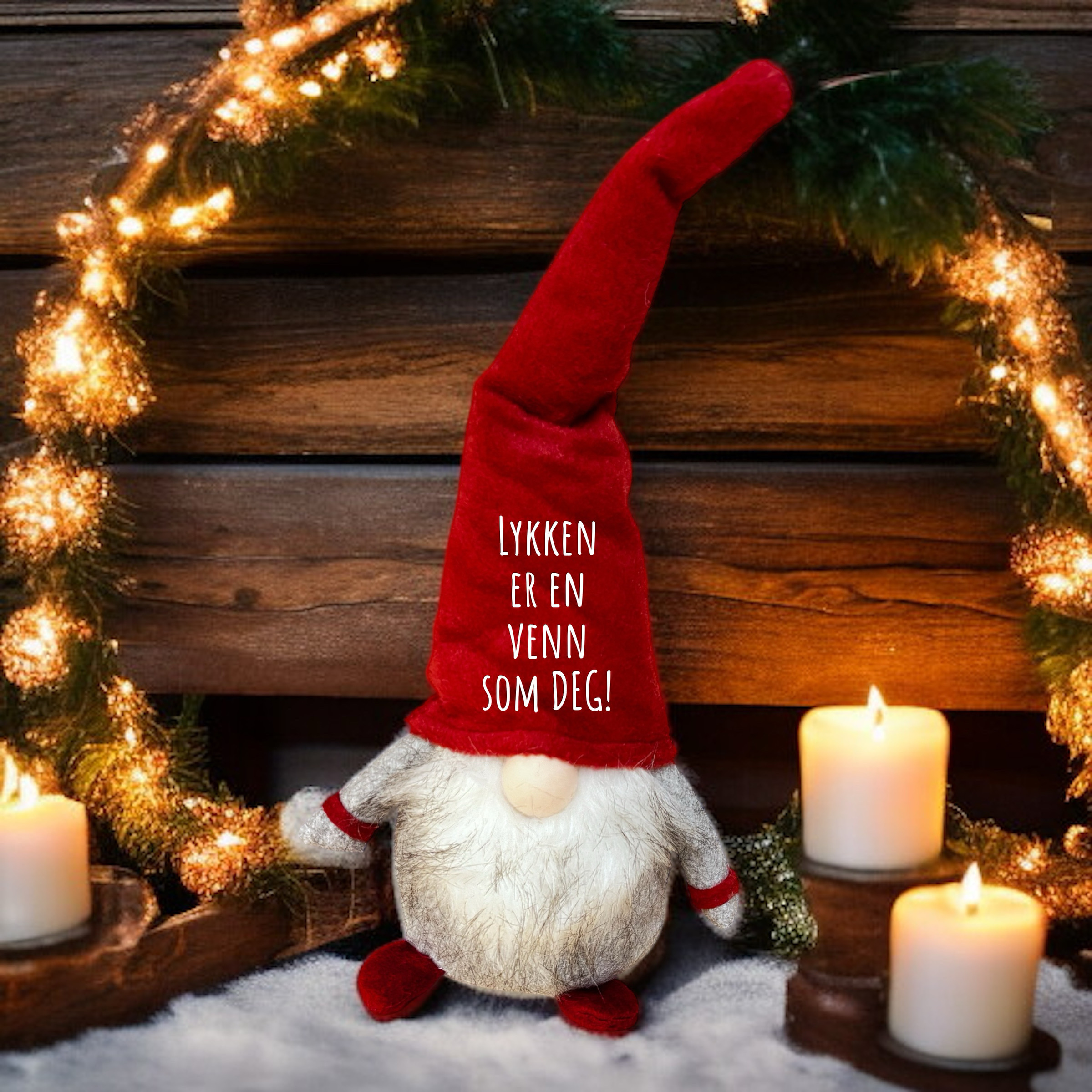 Julenisse med tekst på lua. Du bestemmer selv teksten du ønsker. Nissen er ca 50 cm høy med bøyelig lue. (Ståltråd inni)