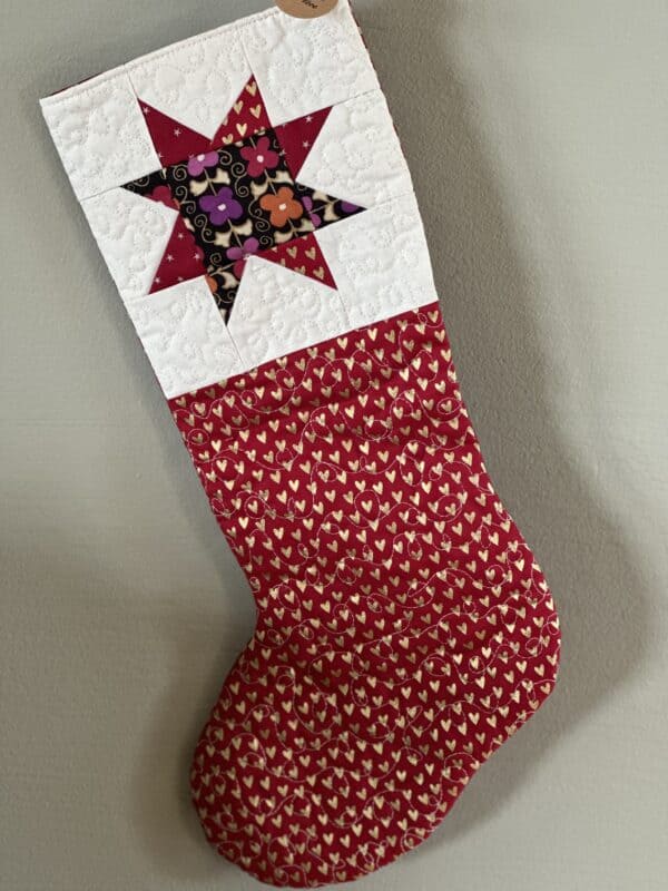 Disse julestrømpene er nydelige dekorasjoner, men skaper også en fin tradisjon. Strømpene er sydd i solide bomullstoffer og har detaljer av både lappeteknikk og frihåndsquilting.