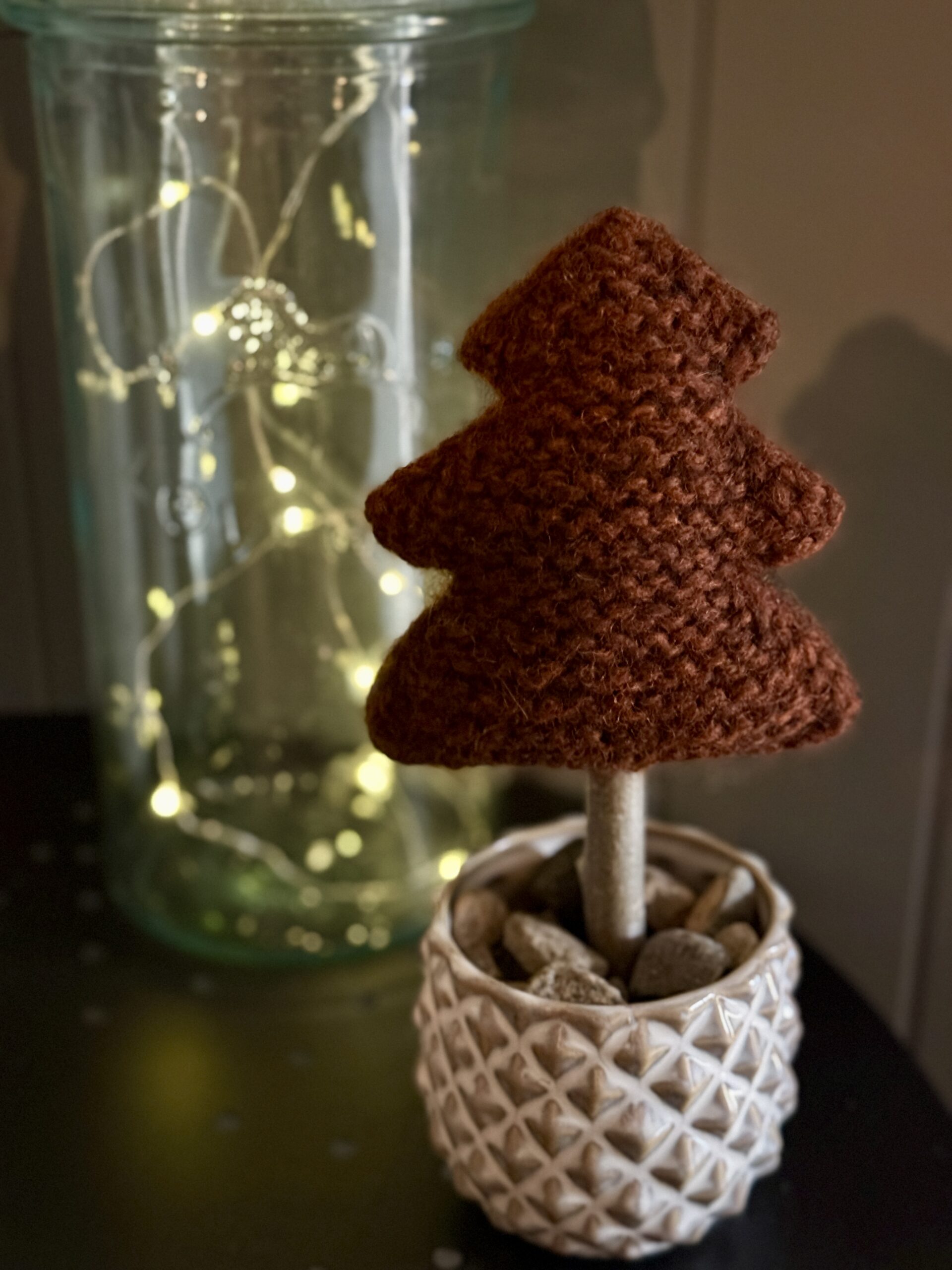 Et juletre i ei lita blomsterpotte. Treet står med en pinne som stamme og er fylt med vatt for å få litt tykkelse. Steinene rundt pinnen i potta gjør at det står stødig.