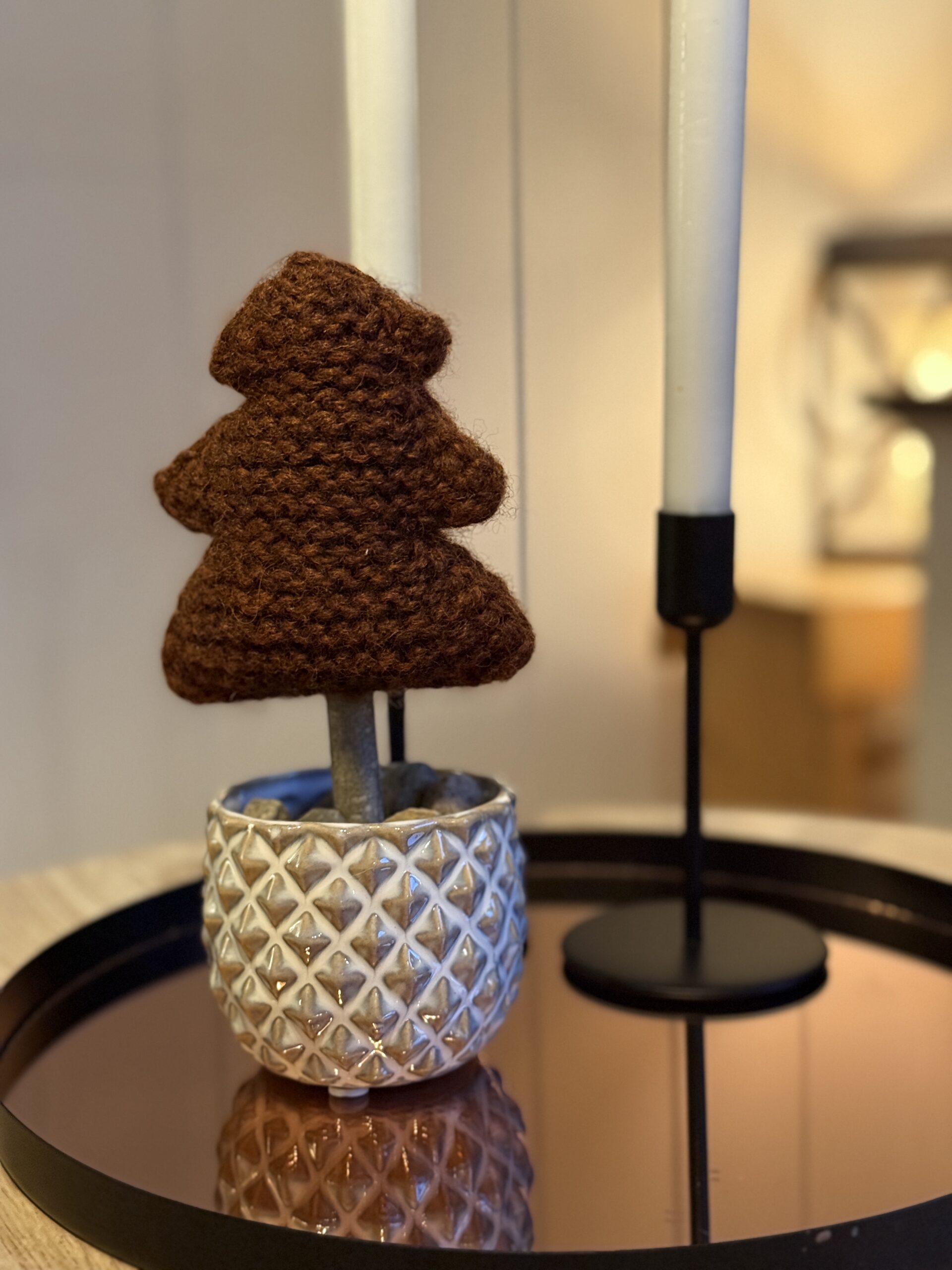 Selve treet er lett tovet og er ca 12 cm høyt, total høyde med potta er ca 22 cm.