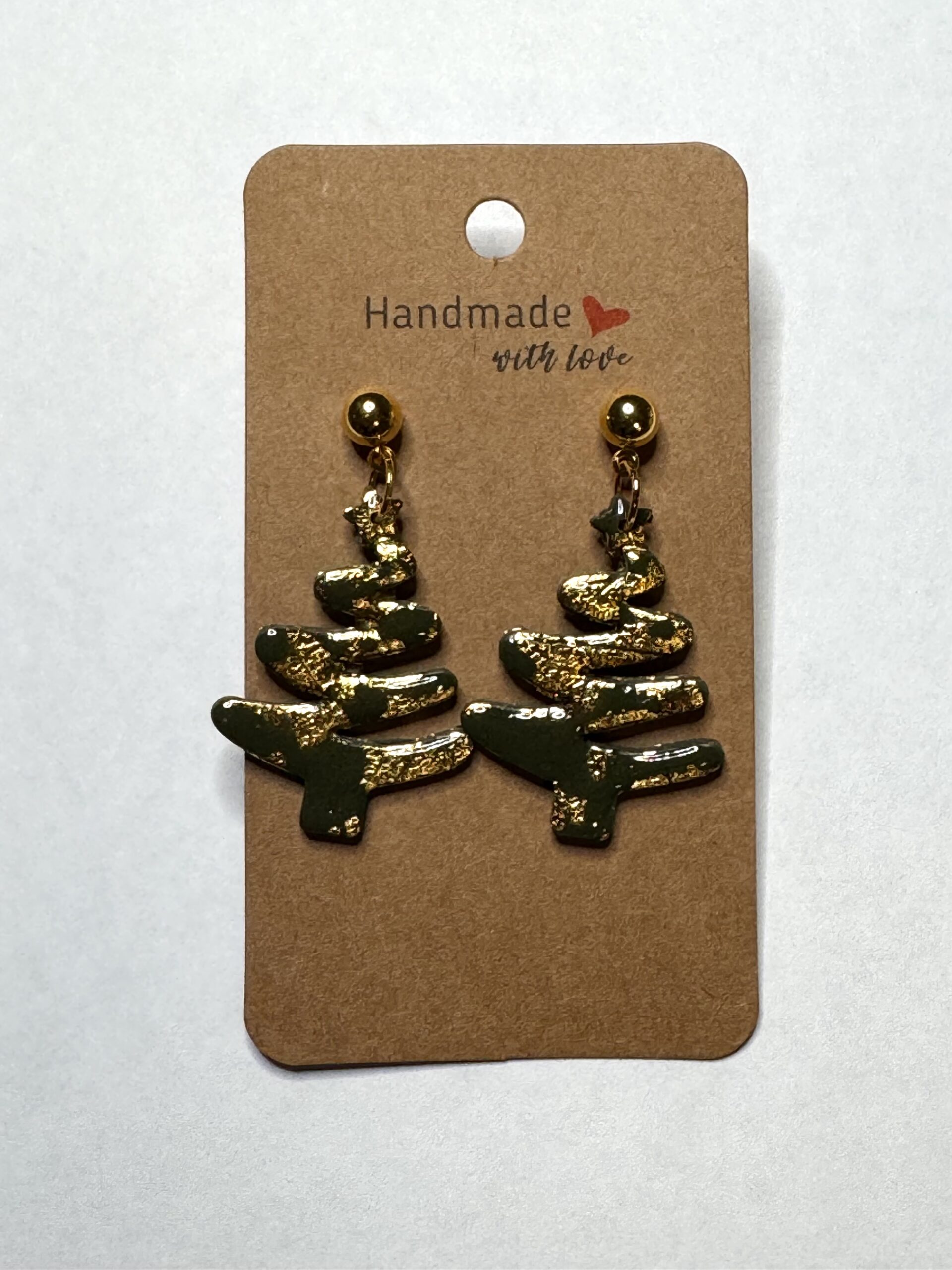 Unike juletre-øredobber med håndpåført gullfolie som gir en eksklusiv glans. Laget for hånd i polymerleire. Perfekte som gave eller til et festlig antrekk.