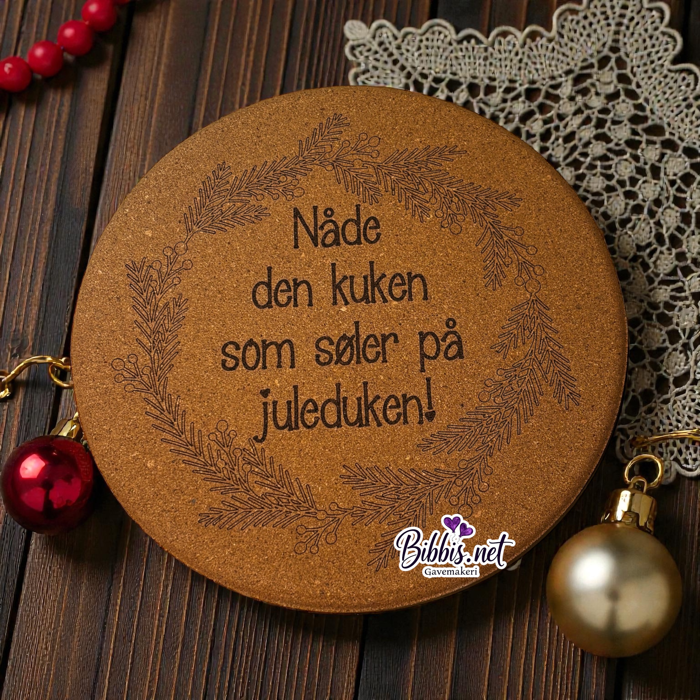 Kork kjeleunderlag str 19cm i diameter. Småfrekk juletekst med ramme rundt.  Kjeleunderlaget er lasergravert.