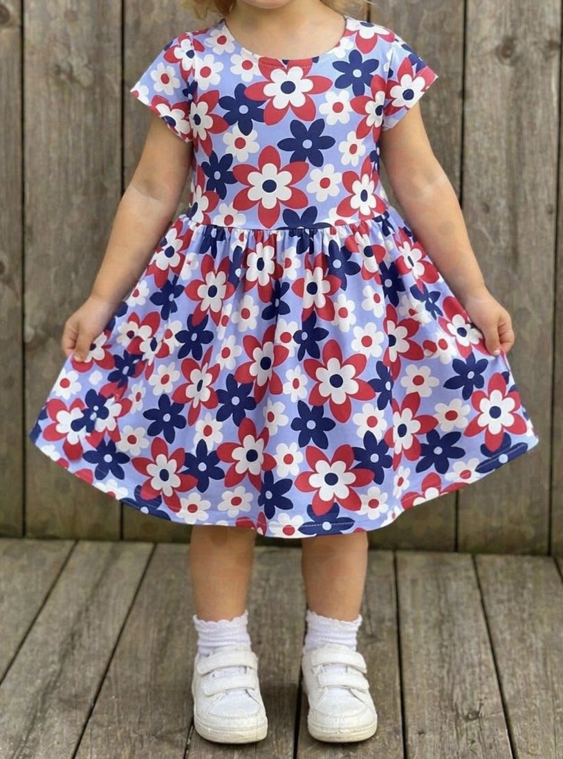 Snurrekjole sydd i myk bomullsjersey, str. 98. Blomster i rødt, hvitt og blått på lyseblå bakgrunn.
