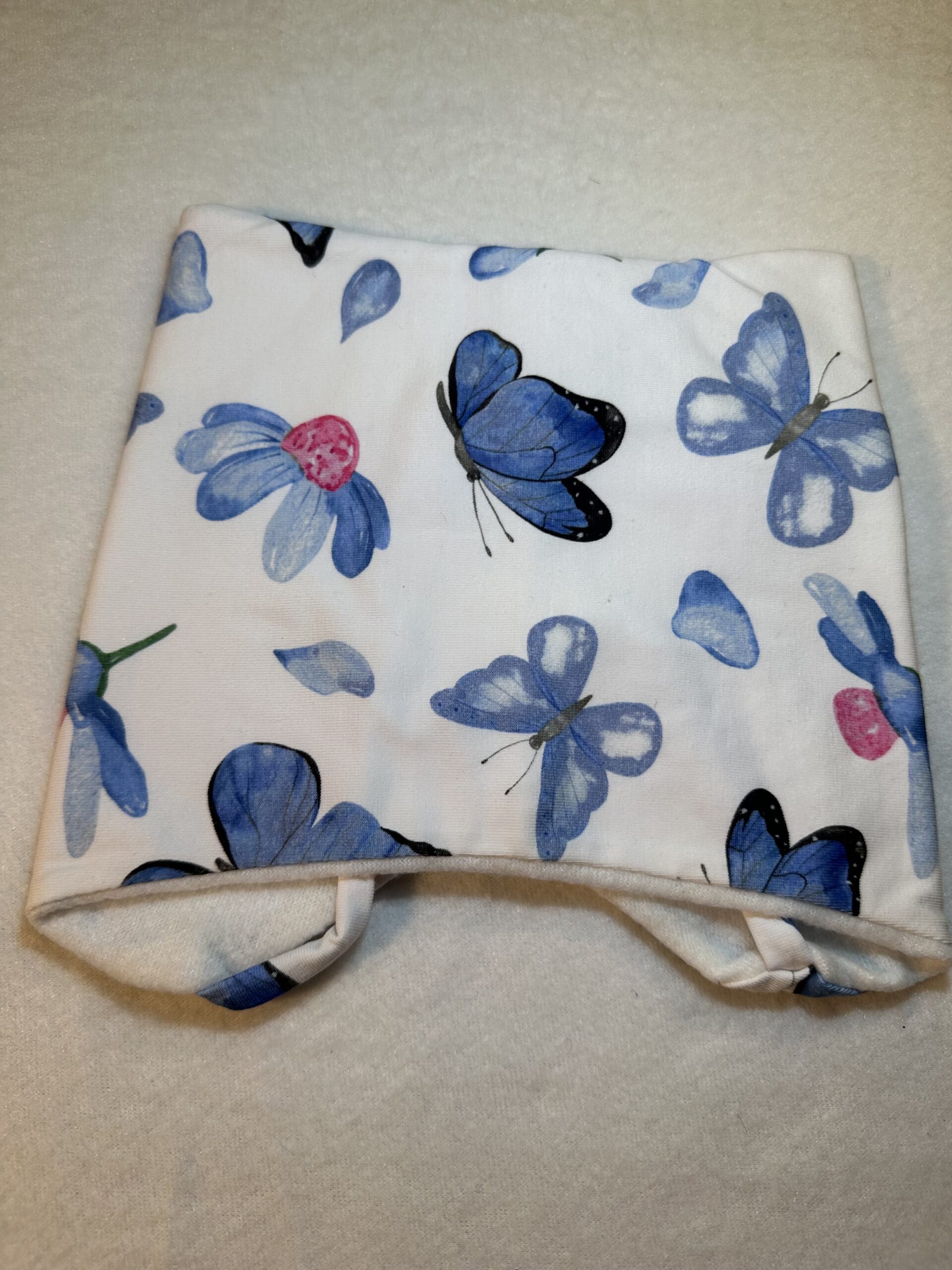Lue med knyting og god passform, sydd med jersey og fleecefor str 1-2 år