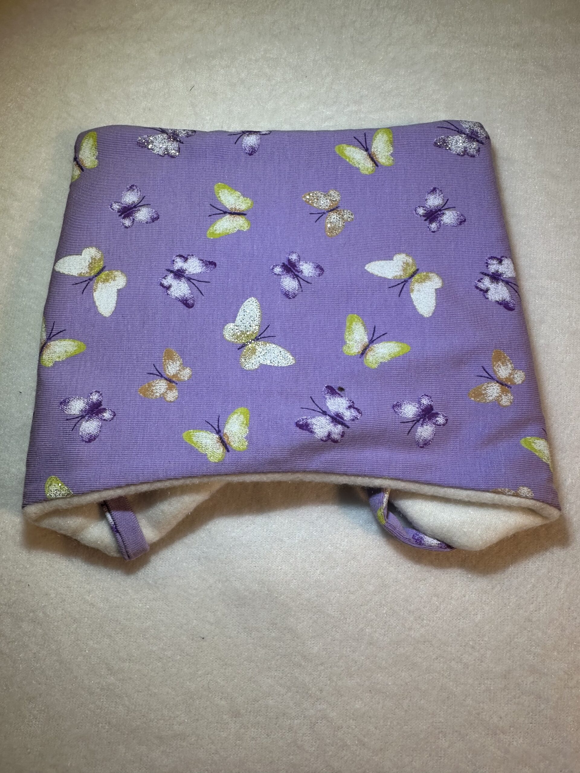 Lue med knyting og god passform. Sydd i jersey med fleecefor str 0-4 mnd.