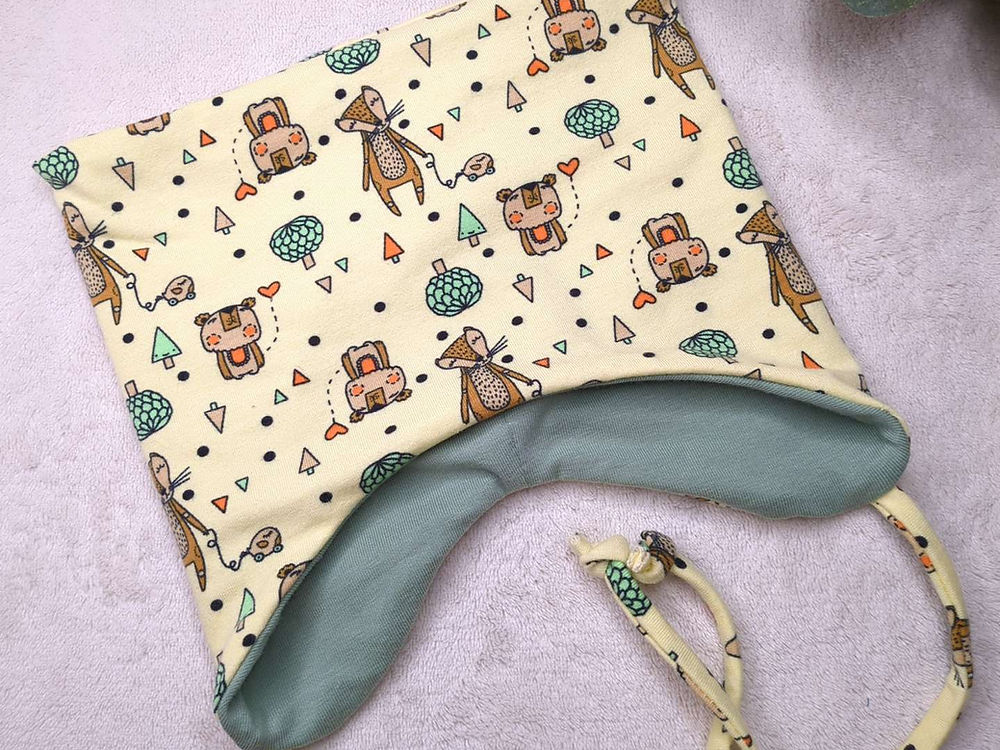 Firkantlue med søte rever og bamser på lysegul bakgrunn. Foret med naturhvit bomull.