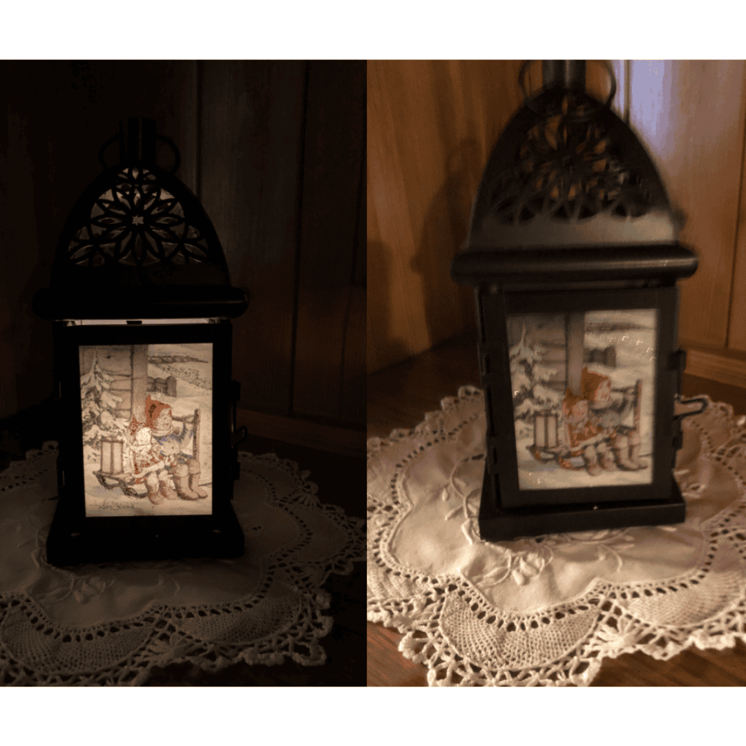 Lyslykt med julemotiv. Vist med og uten lys. Høyde 22 cm.