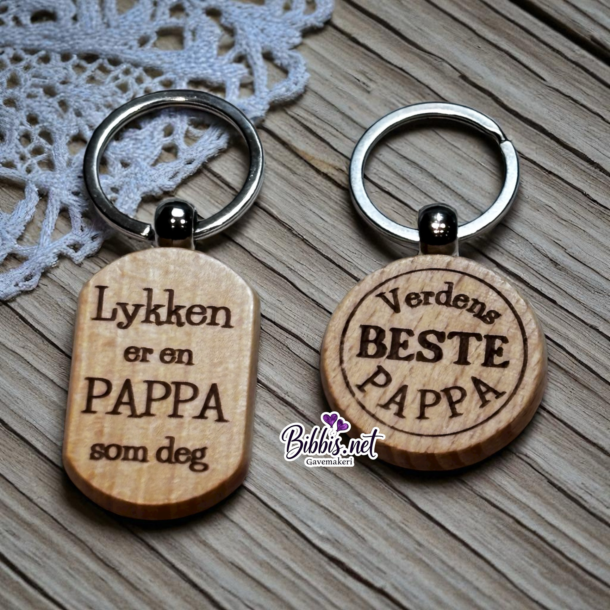 Koselig nøkkelring til pappa. Lasergravert tekst på tre.
