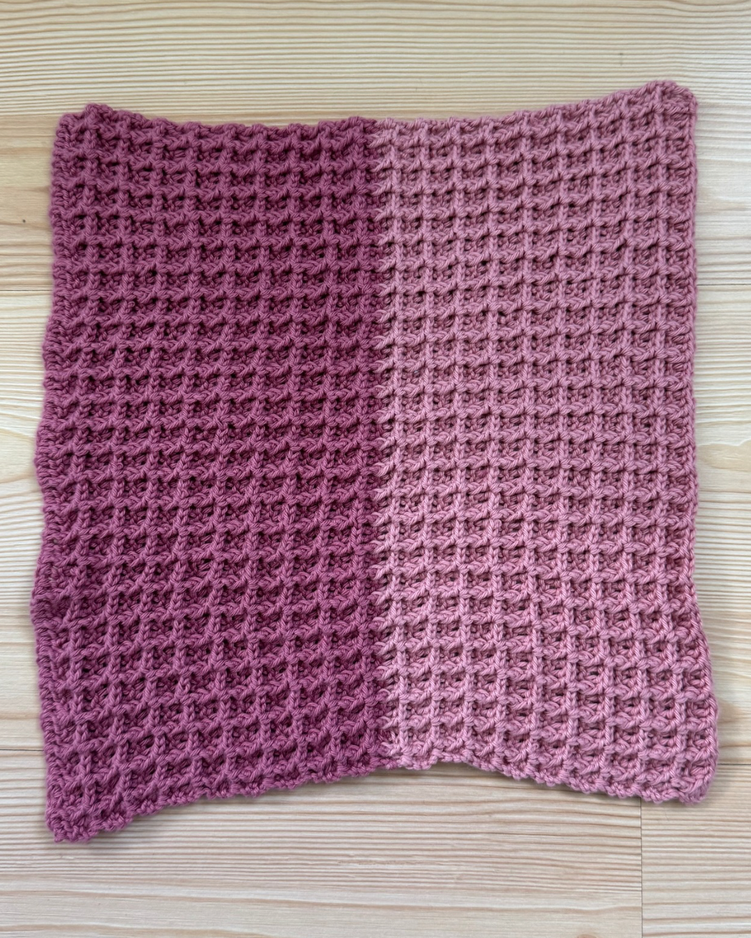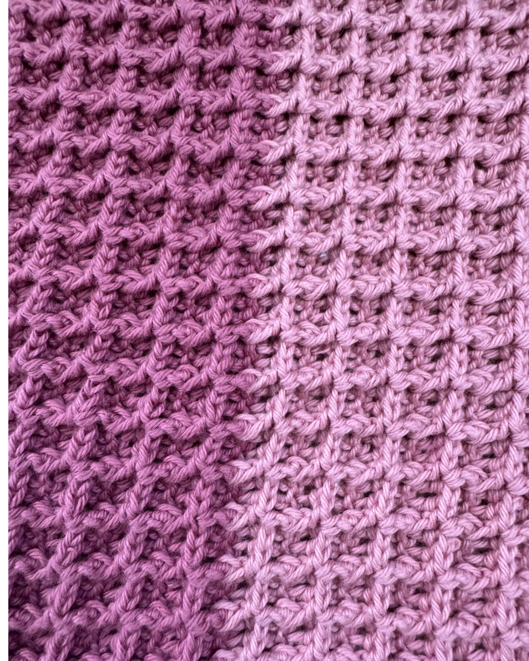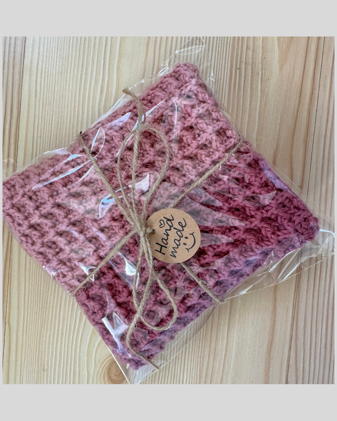 Oppvaskklut heklet i vaffelmasker, noe som gjør den tykk og god. Kluten har god oppsugingsevne og er god å vaske med. Heklet i to matchene farger i 100% bomullsgarn. Kluten måler 27 • 28 cm og er pakket som en liten gave.