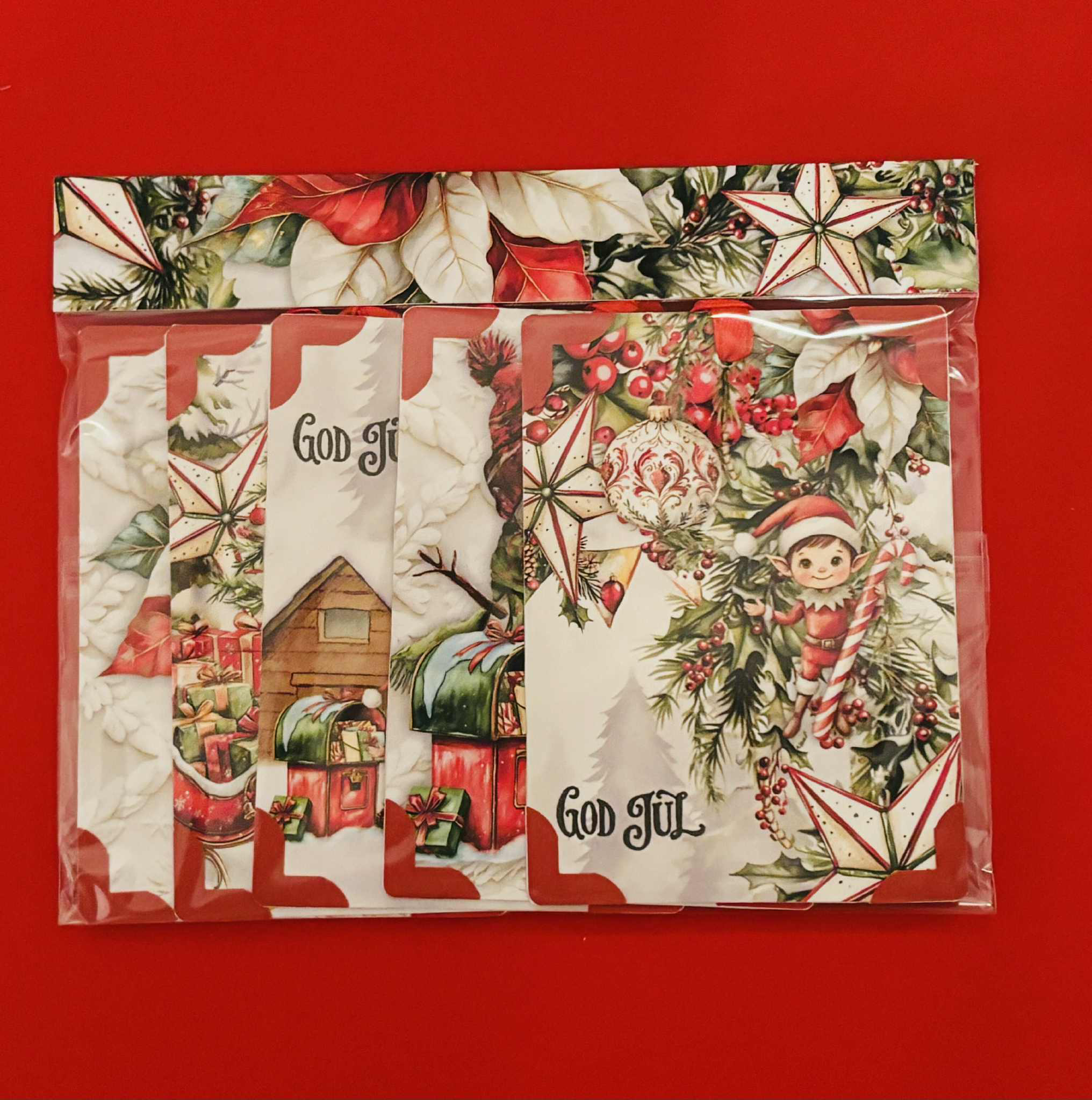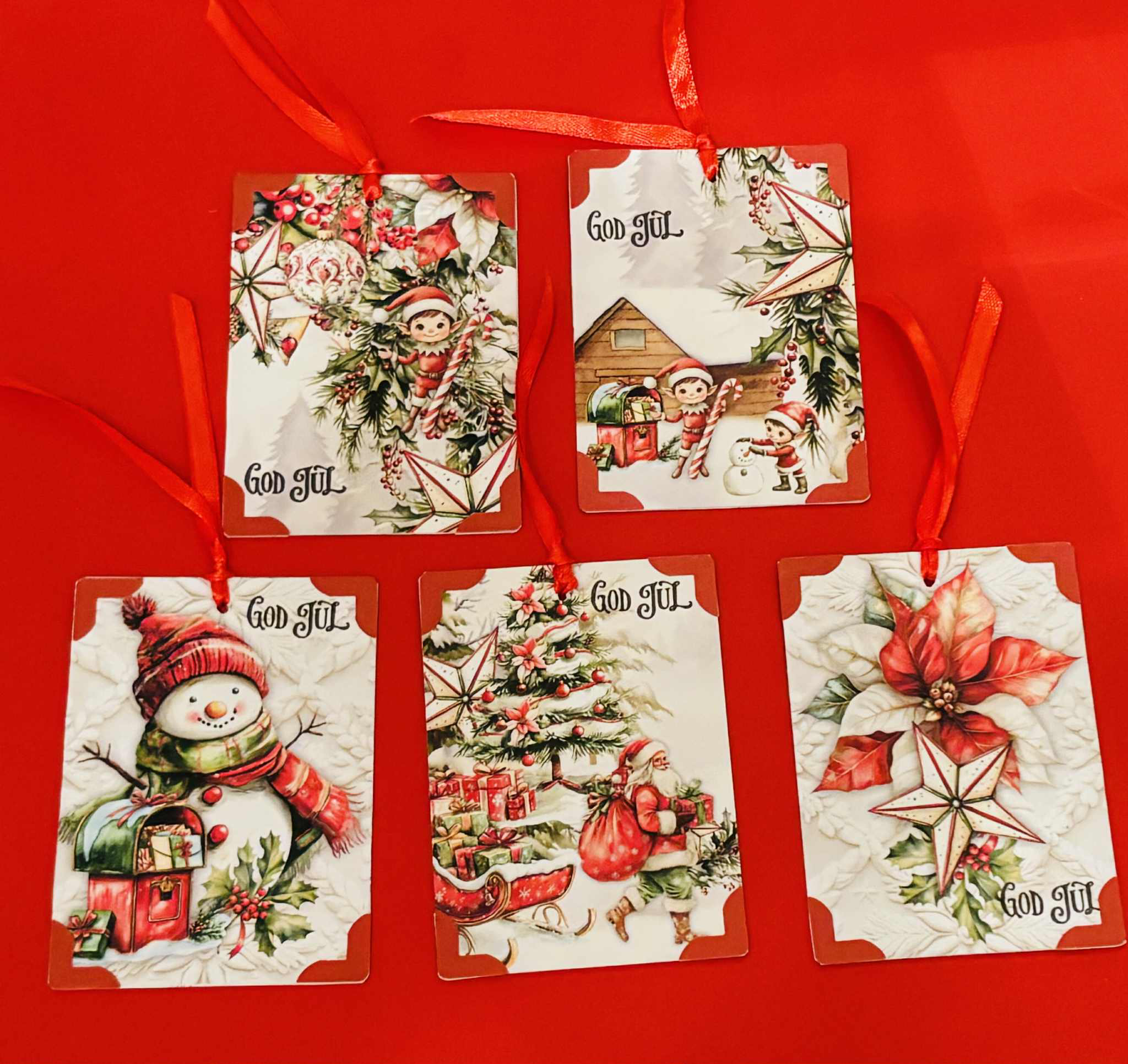 Pakke med 5 stk. håndlagde pakkelapper. De måler ca 10 x 7,5 cm.