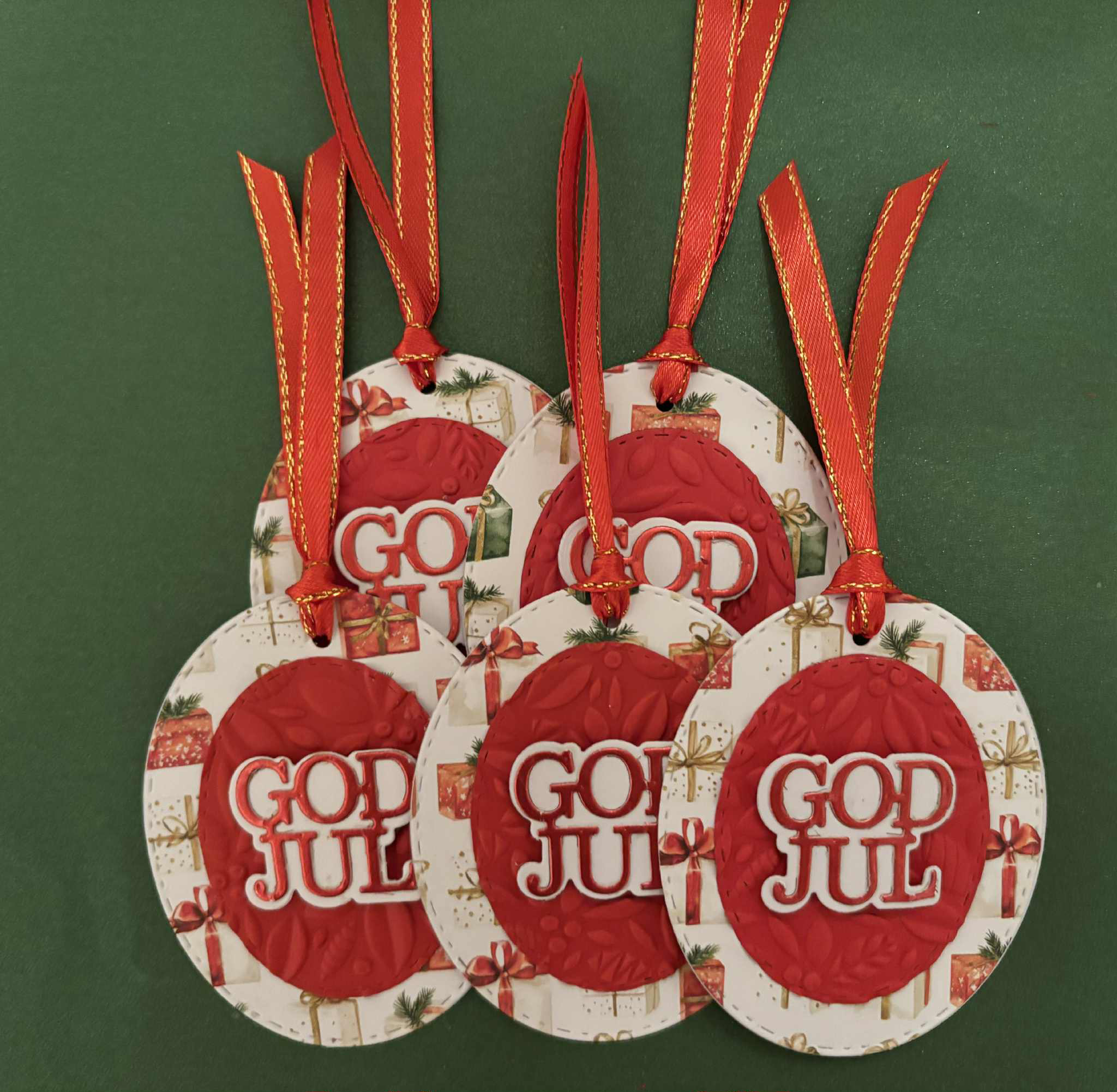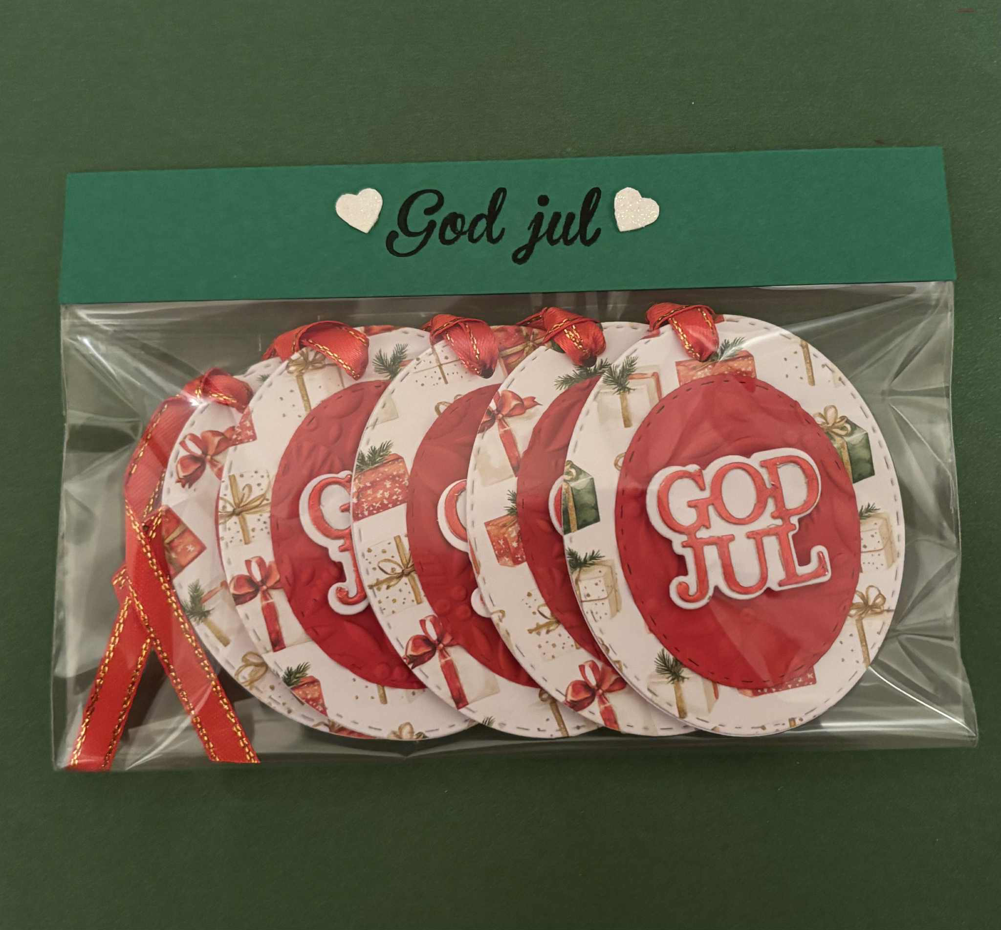 Pakke med 5 stk. håndlagde pakkelapper. De måler ca 7,5 x 6 cm.
