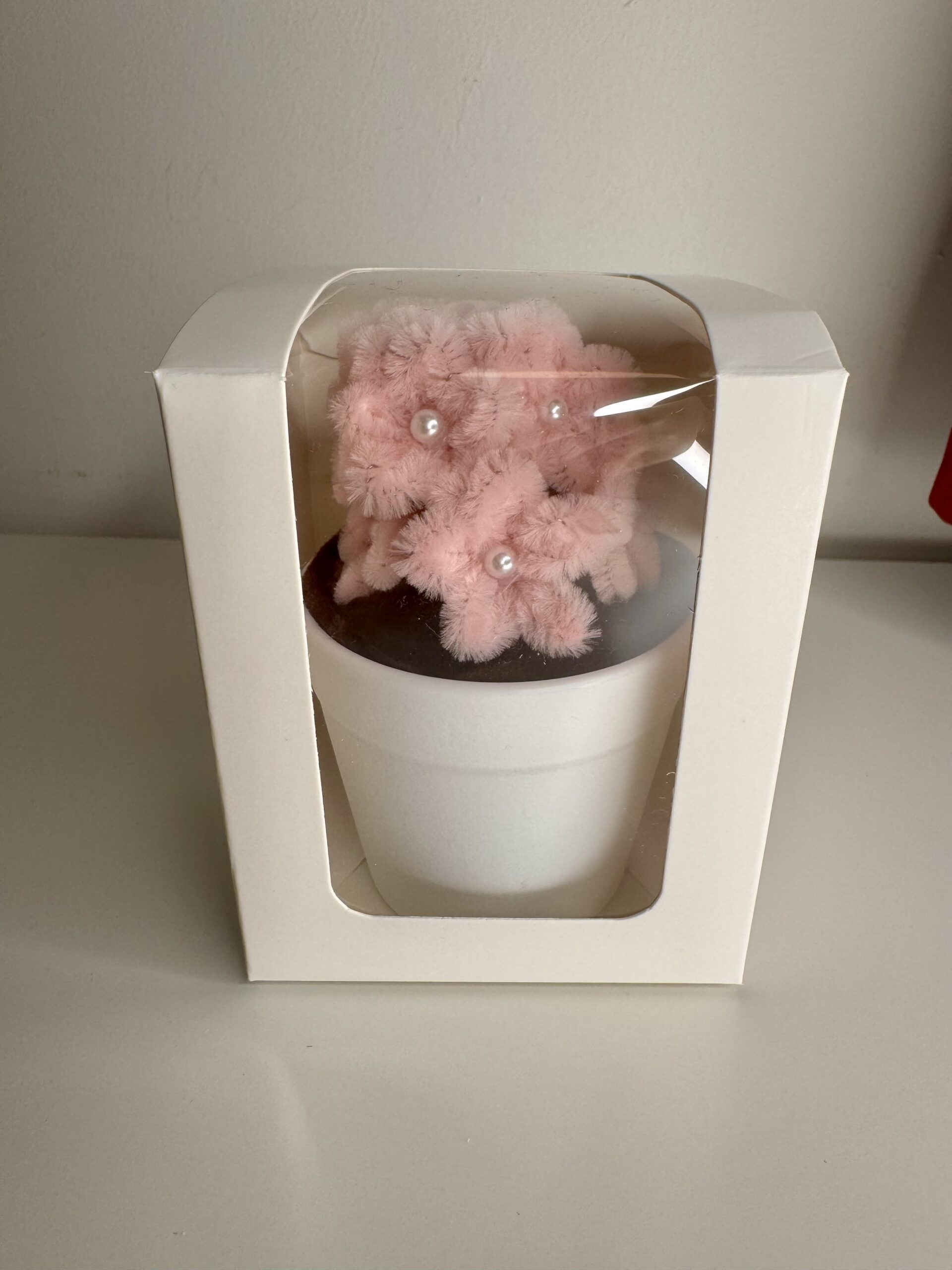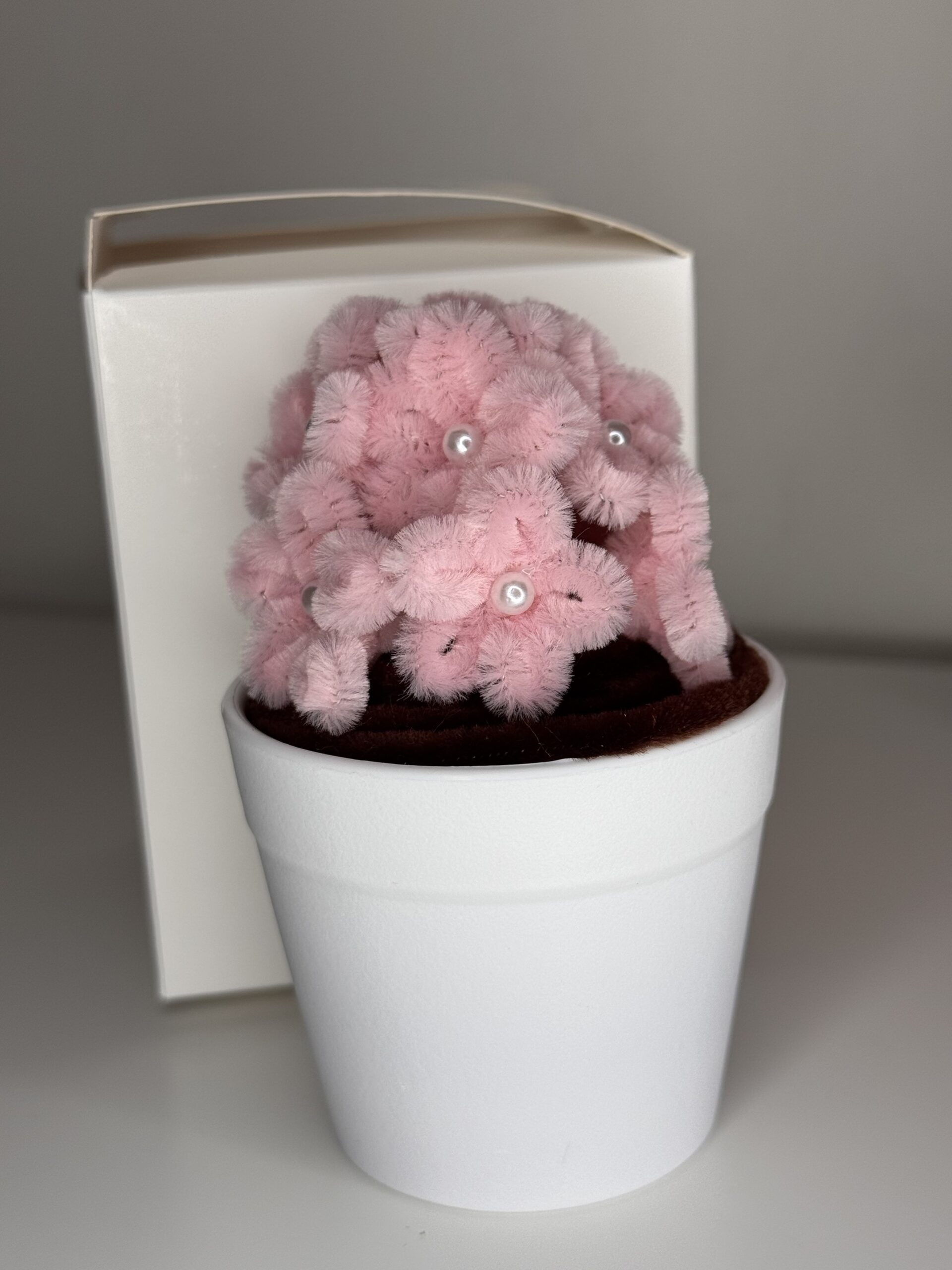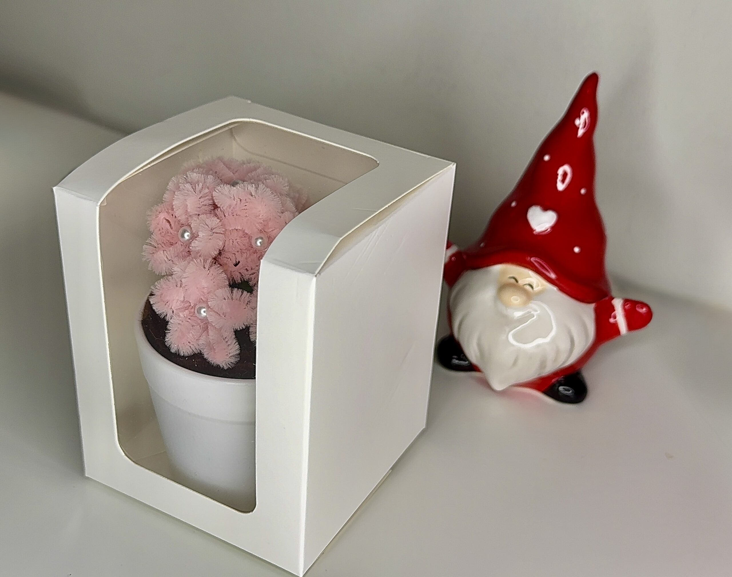Blomstene er lagret for hånd. Selve vasen er av plast. Gaveeske følges med på kjøpet 🥰