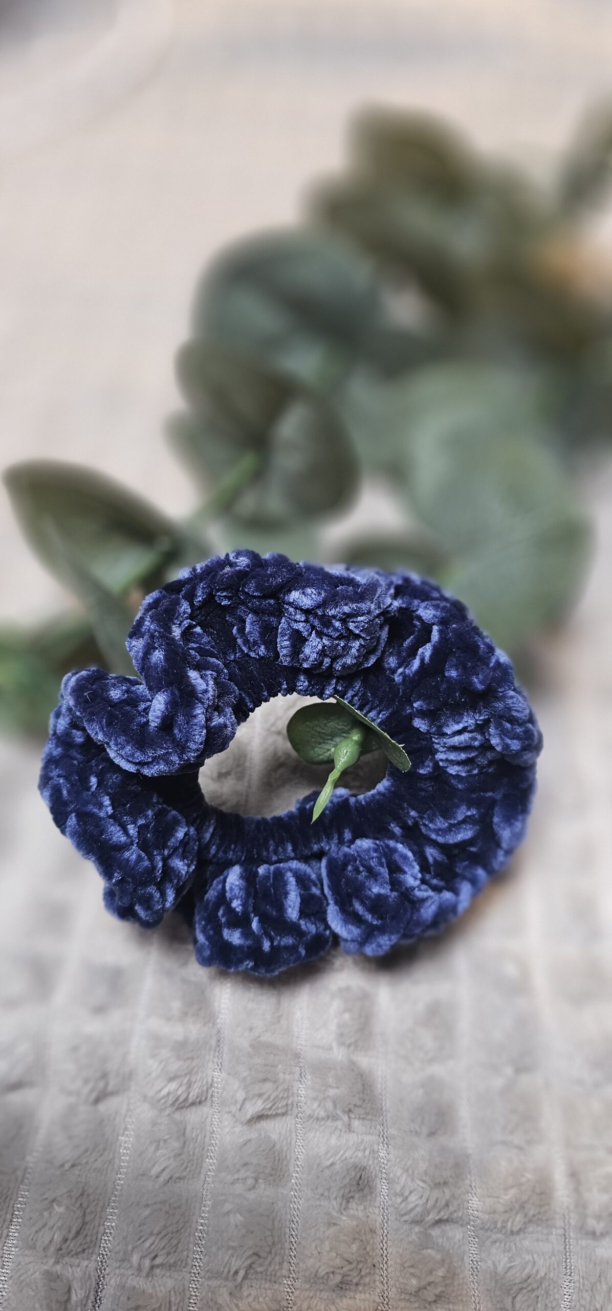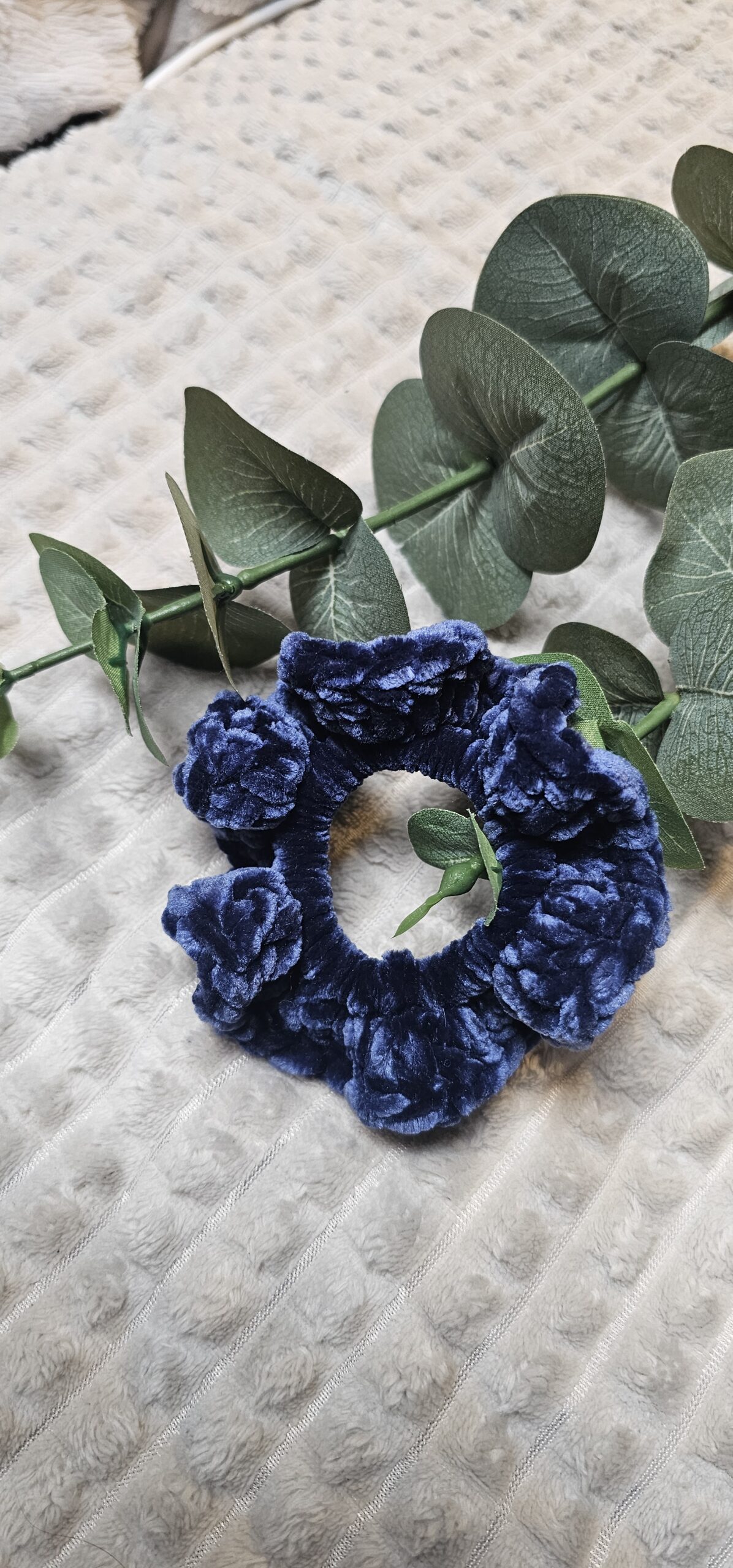 Heklet scrunchie i fuzzy chanille (Blå)
