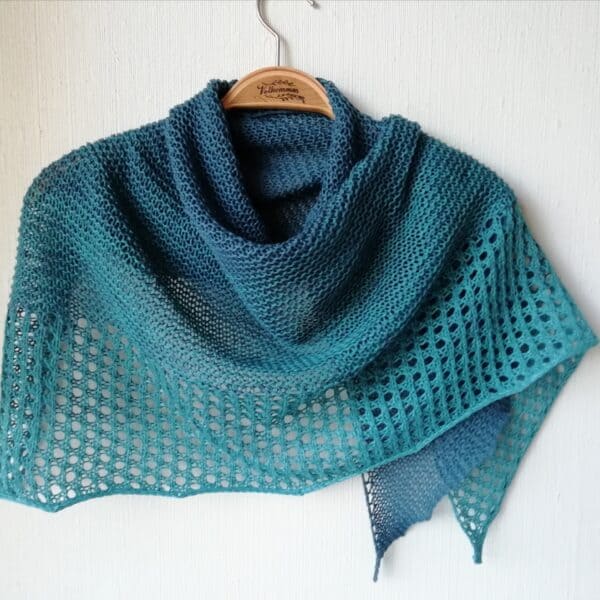 Praktisk sommarsjal strikka i 100% bomullsgarn. Det kan brukast på mange ulike måtar, og har ein fin kant med flott holmønster. Garnet har eit fint fargeskift.