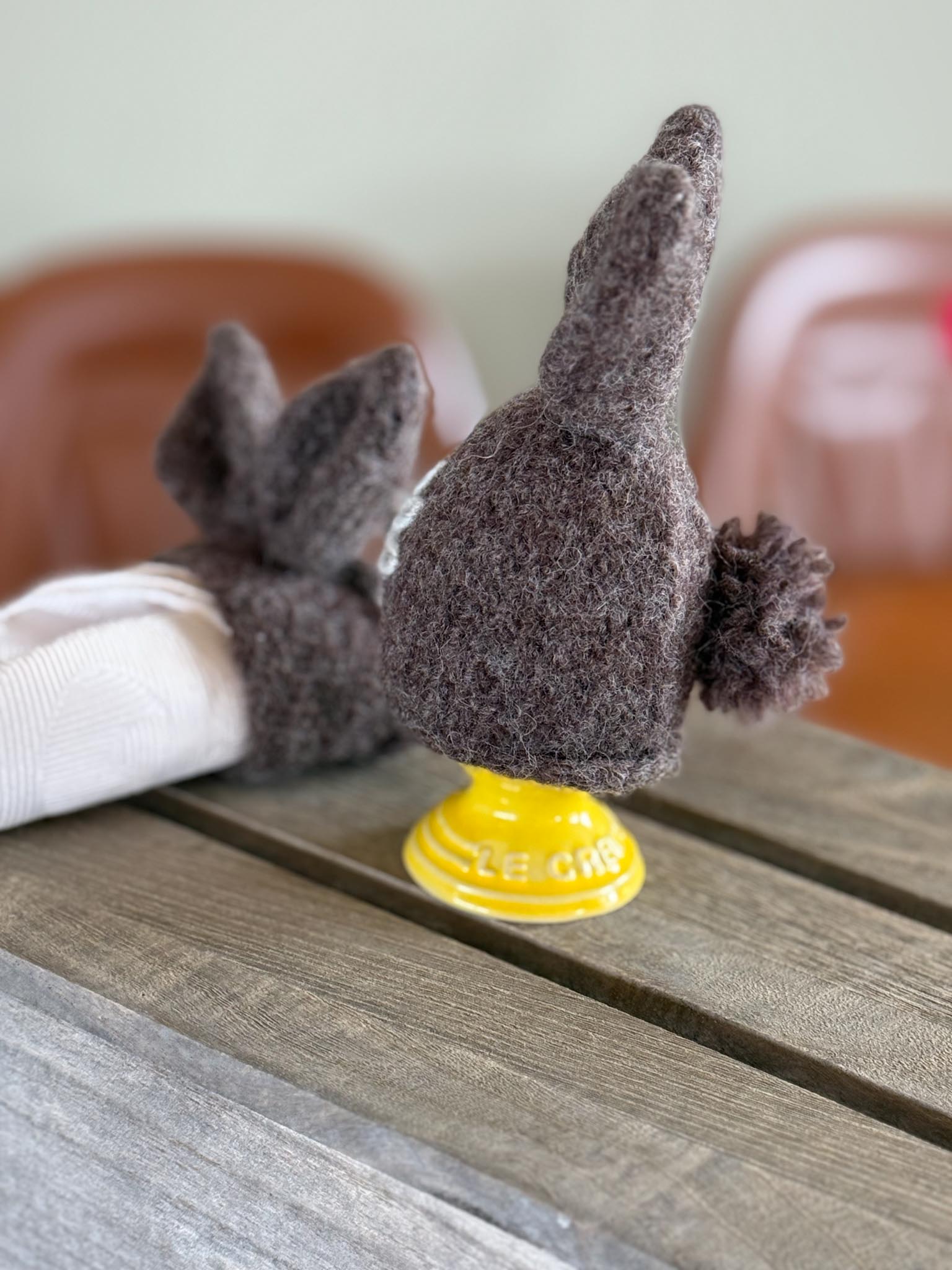 Inkludert i denne oppskriften finner du tovet Harefrøken serviettring og eggvarmer. Eggvarmeren er også fin til å henge opp på en grein som dekorasjon!